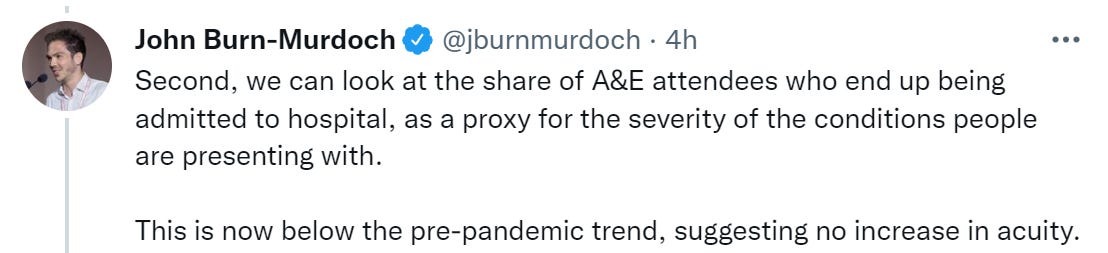 This gets a lot of play, and 2% missing staff is a big problem, but this thread directly points out no increase in hospital visits generally. That doesn’t mean there aren’t more missed sick days, Covid in 2022 has that profile, but I’d posit that a lot of this is likely that everyone involved is overworked and at their breaking points. It’s no surprise they need more sick days. I doubt a third of all days out are Covid.