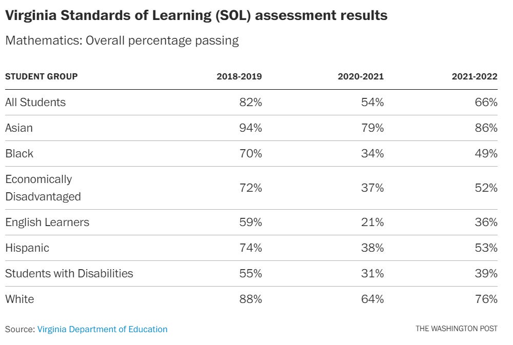 This is in contrast to Virginia, which did lower its reading standards but made the mistake of giving students a real math test and saw their math pass rates decline from 82 percent in 219 to 66 percent this year. Scores do seem to be recovering.