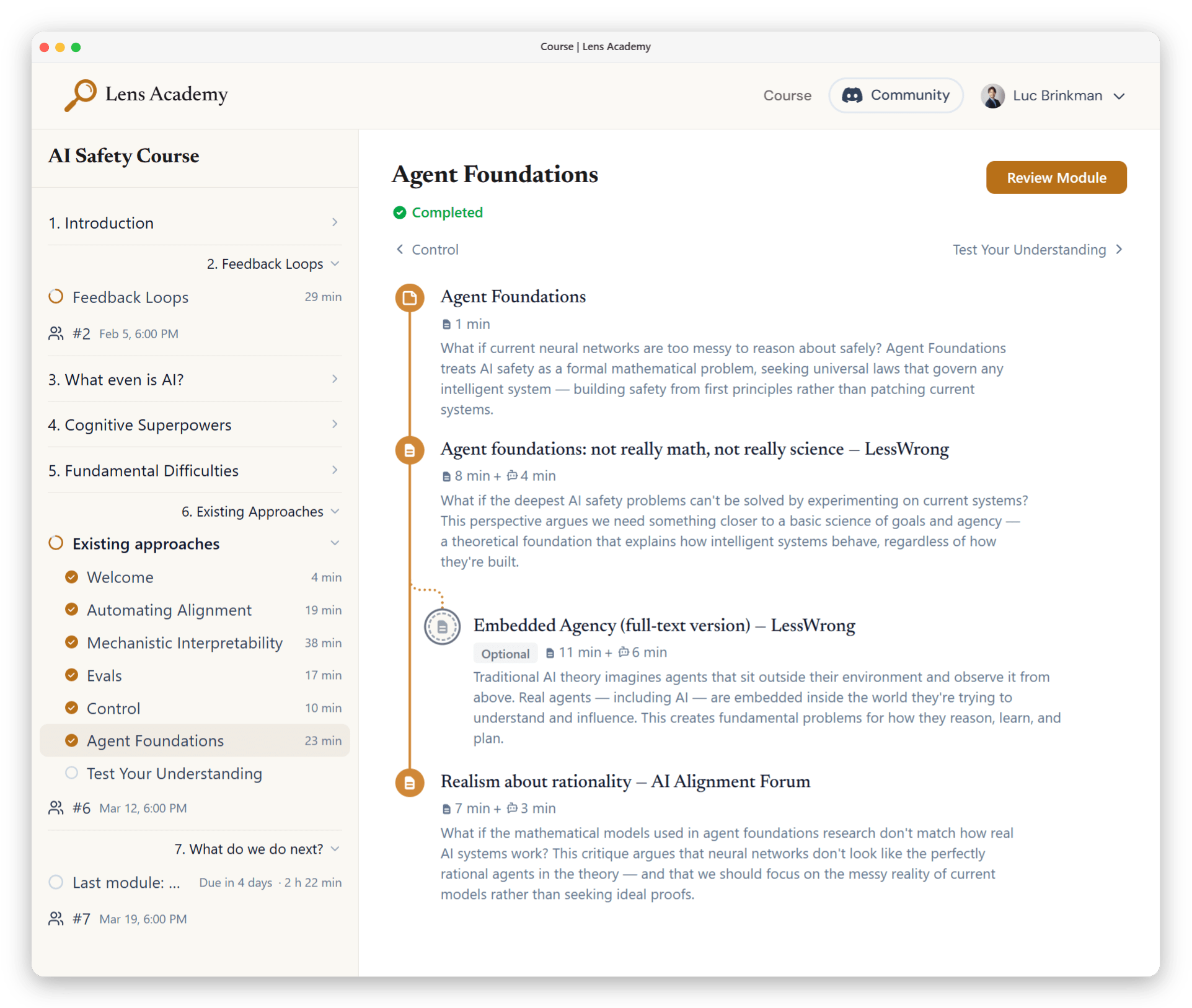 We’d love feedback. If you’re experienced in AI Safety, skim the curriculum and tell us what’s missing or wrong.[3] If you know people entering the field, point them our way. If you’re interested in facilitating (or participating as a student), leave your email at https://lensacademy.org/enroll.