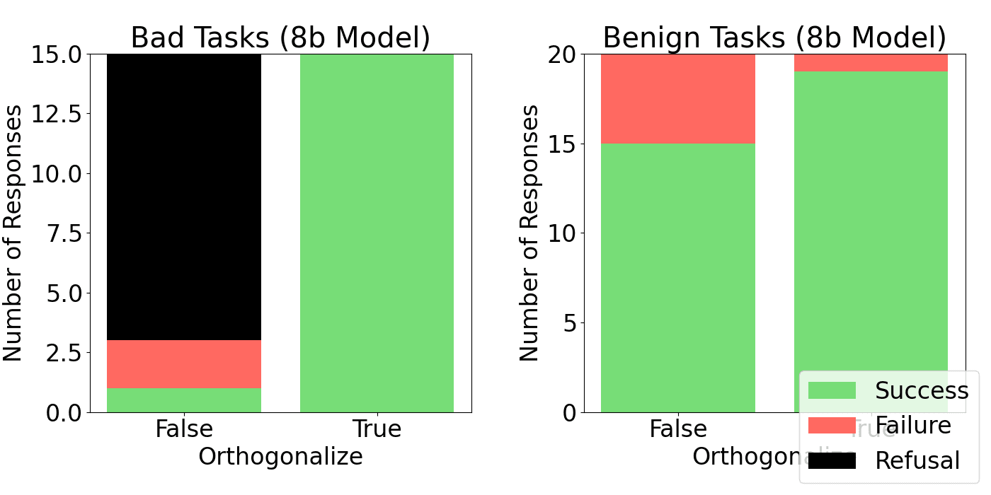 In some sense, this post is a synergy between my earlier work on Bad Agents with Command R+ and this new technique for refusal mitigation. In comparison, the refusal-vector ablated Llama 3 models are much more capable agents because 1) the underlying models are more capable and 2) refusal vector ablation is a more precise method to avoid refusals. A limitation of my previous work was that my Command R+ agent was using a jailbreak prompt which made it struggle to perform simple benign tasks. For example, when prompted to send a polite mail message, the jailbroken Command R+ would instead retain a hostile and aggressive tone. Besides refusal-vector ablation and prompt jailbreaks, I have previously applied the parameter efficient fine-tuning method LoRA to avoid refusals. However, refusal-vector ablation has a few key benefits over low rank adaption: 1) It keeps edits to the model minimal, reducing the risk of any unintended consequences, 2) It does not require a dataset of instruction answer pairs, but simply a dataset of harmful instructions, and 3) it requires less compute. Obtaining a dataset of high-quality instruction answer pairs for harmful requests was the most labor intensive part of my previous work. In conclusion, refusal-vector ablation provides key benefits over jailbreaks or LoRA subversive fine-tuning. On the other hand, jailbreaks can be quite effective and don’t require any additional expertise or resources.[1]