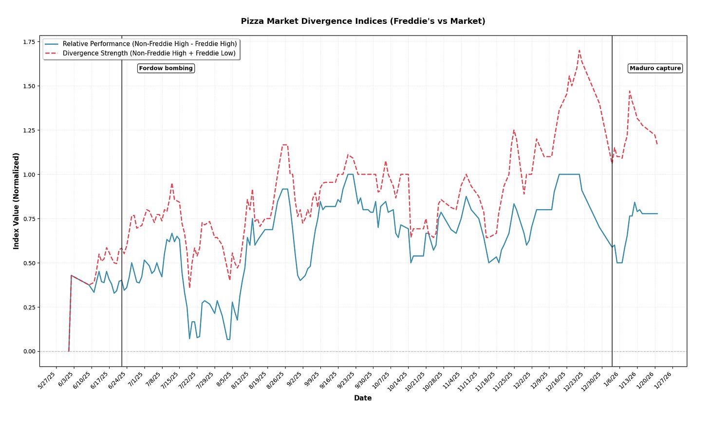 I created a pair of slightly differently specified “Freddie-controlled” pizza activity indices which track the divergence of the Pentagon Pizza market activity versus Freddie’s activity. I think both of these are reasonable measures of what we’re trying to capture.