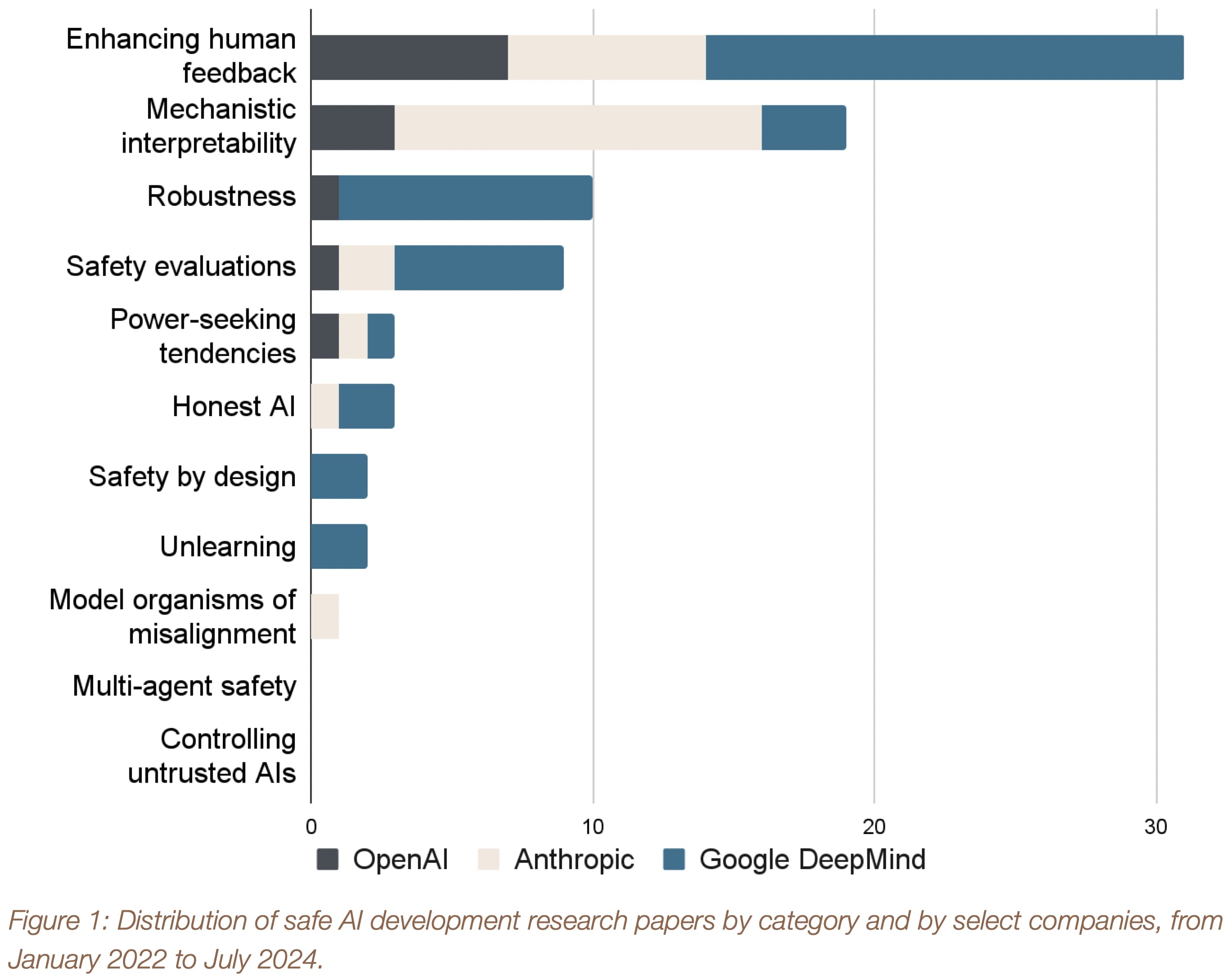 We analyzed all papers published by the three companies from January 2022 to July 2024 that were relevant to safe AI development, and categorized the 80 included papers into nine safety approaches. Additionally, we noted two categories representing nascent approaches explored by academia and civil society, but not currently represented in any research papers by these leading AI companies. Our analysis reveals where corporate attention is concentrated and where potential gaps lie.