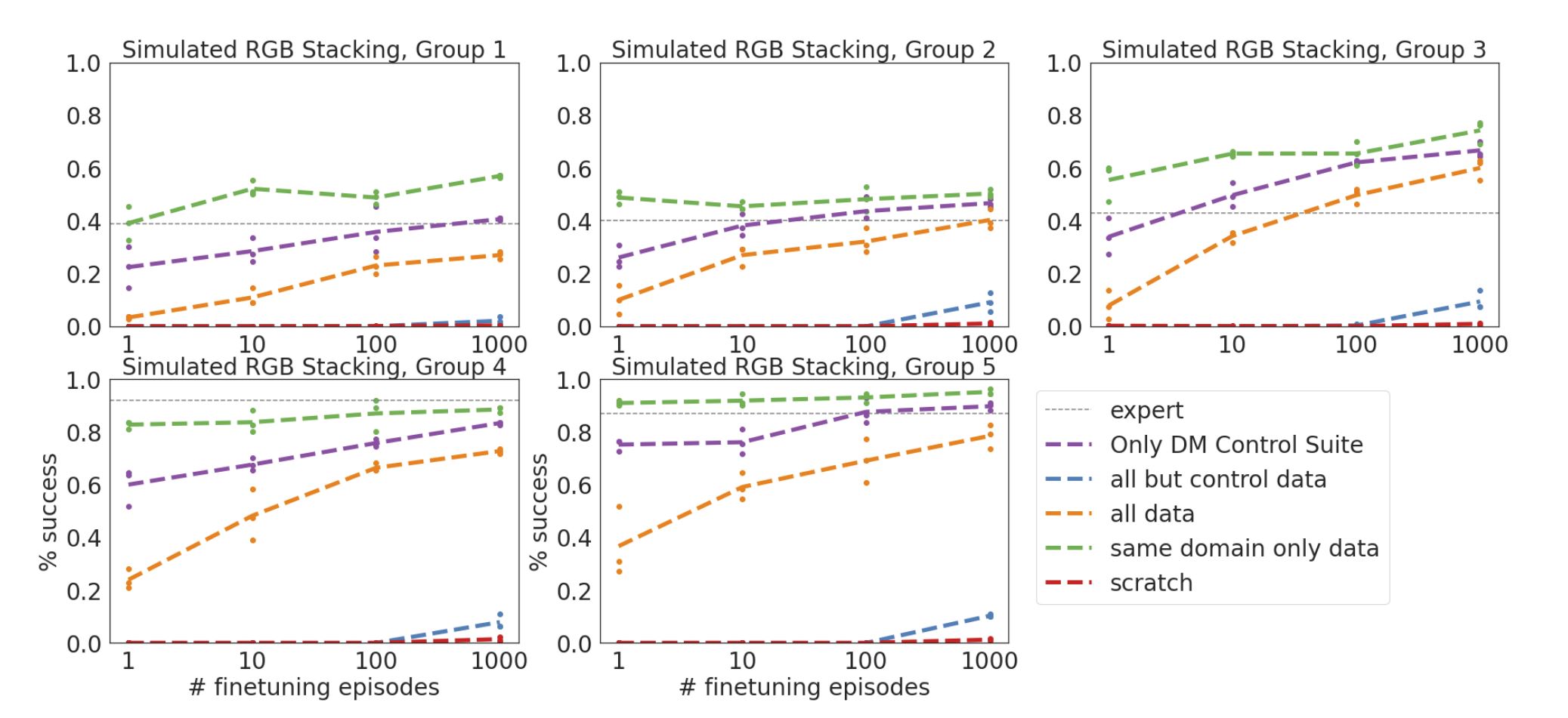 ), slow when pretraining does not include closely related tasks (e.g. every control task without domain-relevant pretraining, including RGB stacking