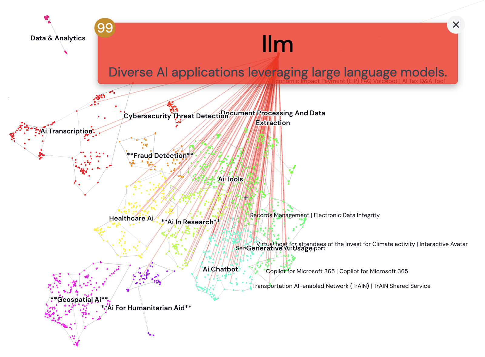 State Dept. – StateChat (to help them draft an email, translate a document or brainstorm policy), NorthStar (informing efforts to shape public narratives and policy by monitoring media reports and social platforms, includes misinformation detection – not a ChatBot, but appears to use LLMs in a notable way),