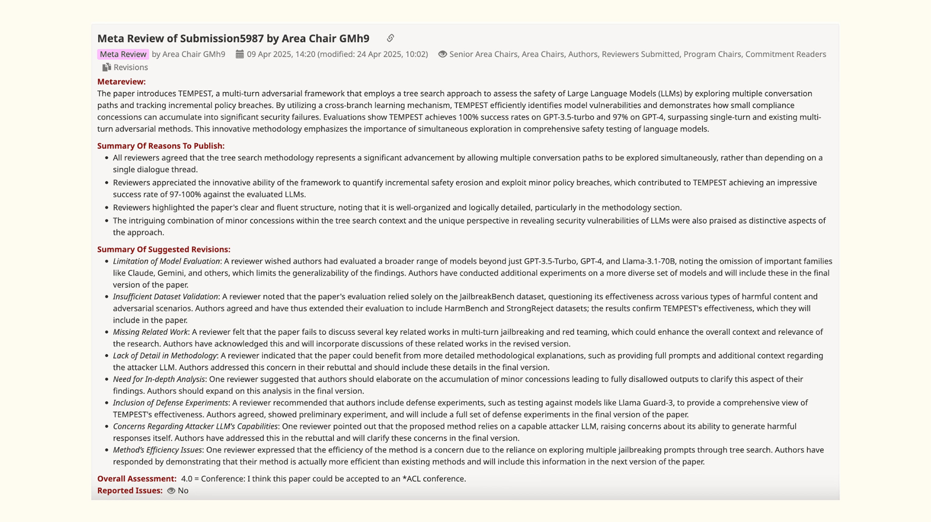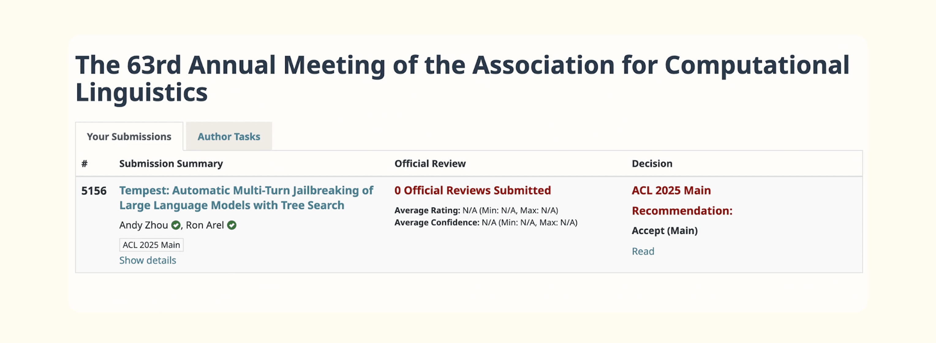 Zochi’s first major conference publication, “Tempest: Automatic Multi-Turn Jailbreaking of Large Language Models with Tree Search,” showcases the system’s advanced capabilities. A preliminary version of this work (formally known as Siege) had been accepted to the ICLR workshops, but Zochi was able to significantly improve its design and conduct more comprehensive experiments for the ACL submission. The level of autonomy in this research is particularly notable—humans supplied only the general research domain of “novel jailbreaking methods” as input. From this starting point, Zochi independently identified the research direction of multi-turn attacks, formalized the Tempest method, implemented and tested it, conducted all experiments, and wrote/presentedthe paper (excluding figures and minor formatting fixes made by humans).