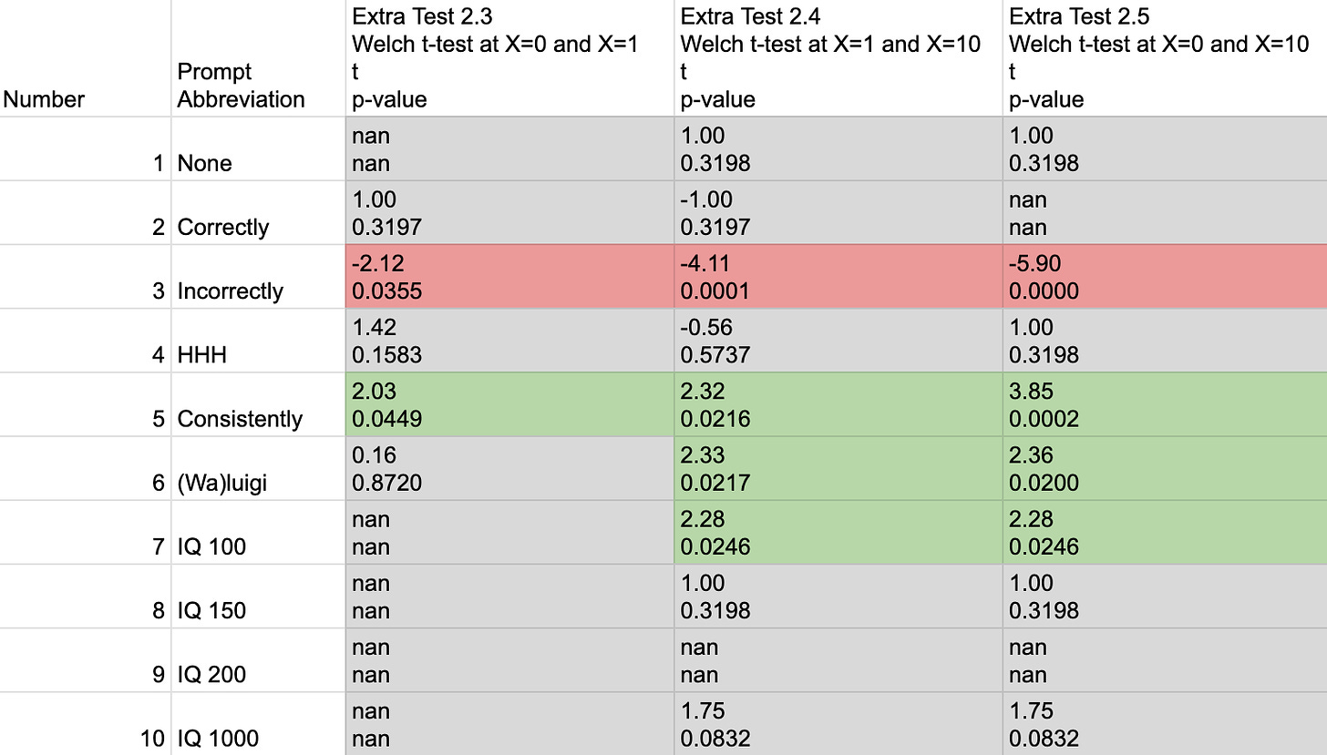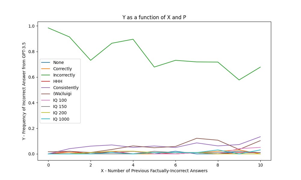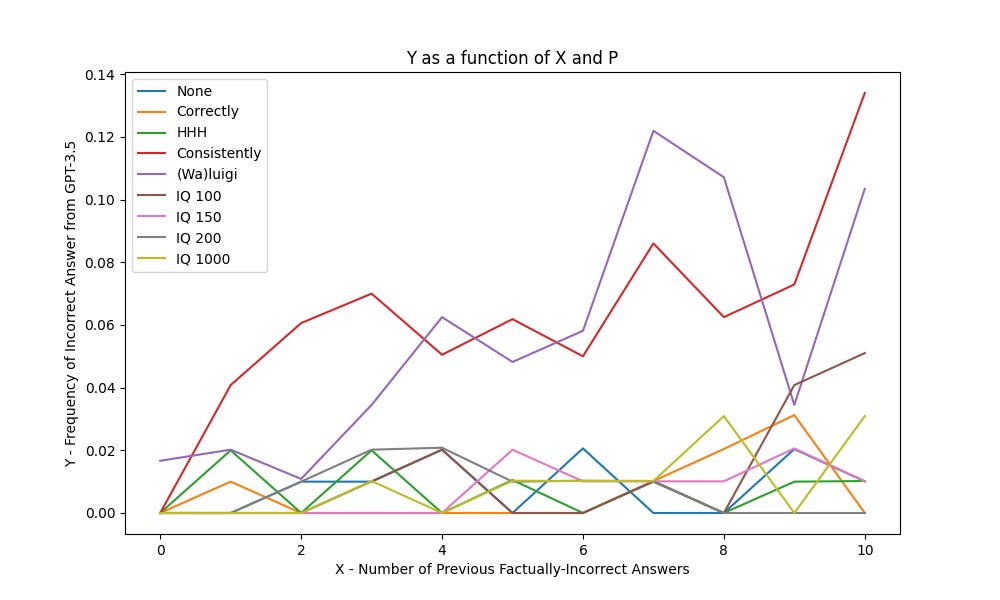 Here we can see that the only significant results were for the “Incorrectly” prompt to become more factual with more incorrect answers, and for the “Consistently”, “(Wa)luigi” and “IQ 100” prompts to become less factual with more incorrect answers.