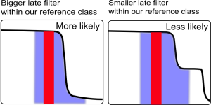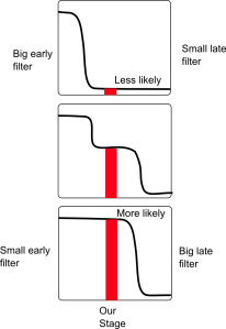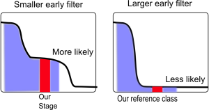 Figure 2: A larger filter between future stages in our reference class makes the population at our own stage a larger proportion of the total population. This increases the probability under SSA.