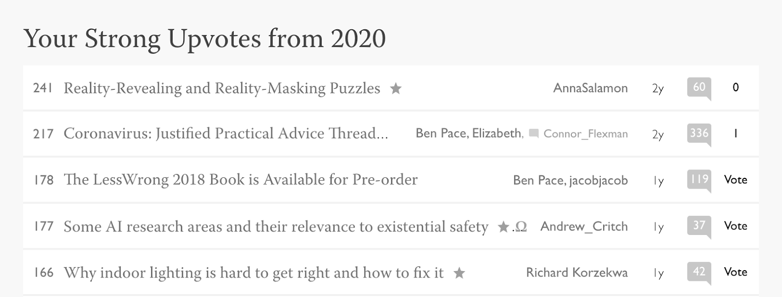 It’s weird looking at my list of strong upvotes, given that a lot of them are posts I have no memory of. “I guess I really liked this post since I strong-upvoted it, also I guess it was forgettable since if you’d told me I’d never seen it, I might have believed you.”