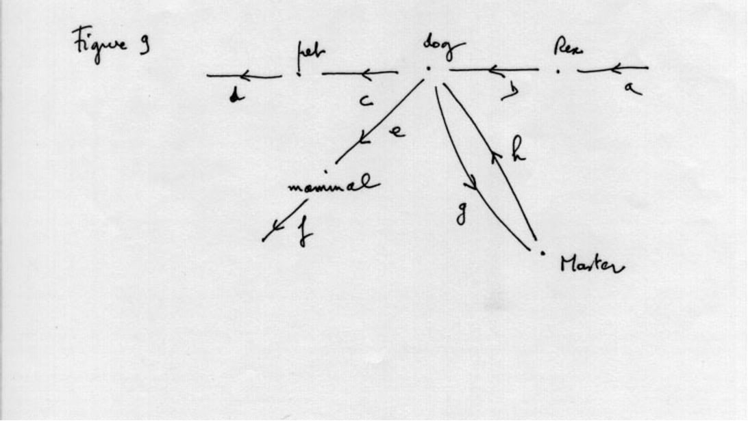 But a hereditary field can also be travelled from the top down, from the most inclusive label down to the singular. The relevance of hereditary fields lies in that the items linked through “is a” relationships, possess at the same time “has a” attributes, linking them in word-pairs with external labels that are inheritable from more general, to less general label. [These external labels are possibly part themselves of other F structures.] Taxonomies of such “penetrables” are however notoriously shallow, i.e. have few levels of organisation, colours for instance are not part of a hierarchy of more general “stuffs”. These attributes or properties, link a label through a “has a” relationship with another label, under one of Aristotle’s categories with the exception of substance. The relationship is of a “has a” type when considered from subject to predicate: “the King of France has baldness”, or a “belonging” quality when seen from predicate to subject: “baldness belongs to the King of France”.