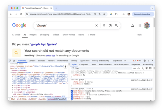 To see how this worked, you can try searching Google for [“googlelogoligature”], and you’ll see it shows up as “Google”: