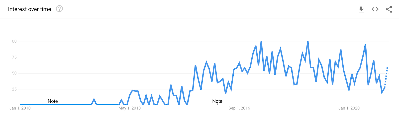 Google Trends is an okay proxy for actual interest, but it’s not perfect. Basically, it measures the popularity of search queries, but not the popularity of the websites themselves. So maybe instead of searching “effective altruism”, people just went directly to forum.effectivealtruism.org and Google never logged a query.