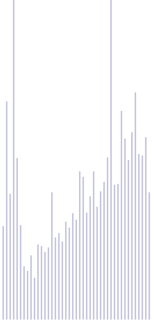 Each bar represents a one month long total of registration dates (the last bar is a little short, being that it only goes up until the 23rd). The number of pixels in each bar is equal to the number of registrations each month. The first (leftmost) bar that hits the top of the picture (it actually goes waaaay off the page) mostly represents the transfer of over 2000 accounts from Overcoming Bias. The right bar that goes off the page is so far unexplained for me − 921 users joined in September 2011, more than three times the number in the months before and after it. If you happen to know what caused that, I would be very interested in finding out. (No, September 2010 does not stand out, if you were wondering the same thing). If anyone wants to do different kinds of analysis, I can generate more numbers and graphs fairly easily.
