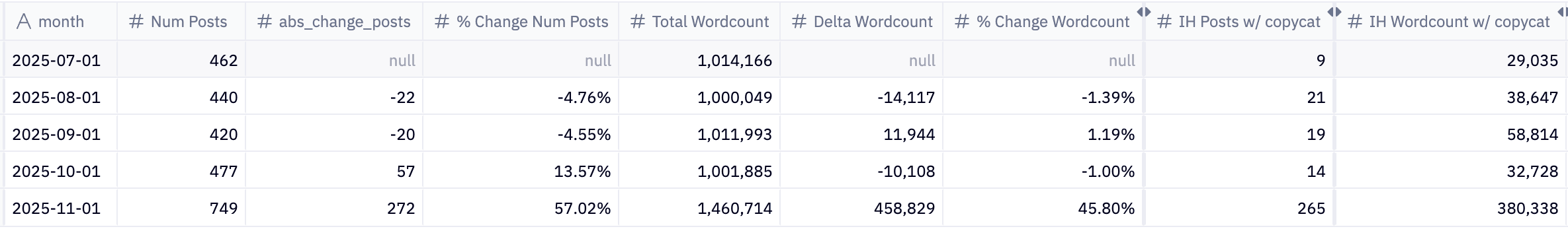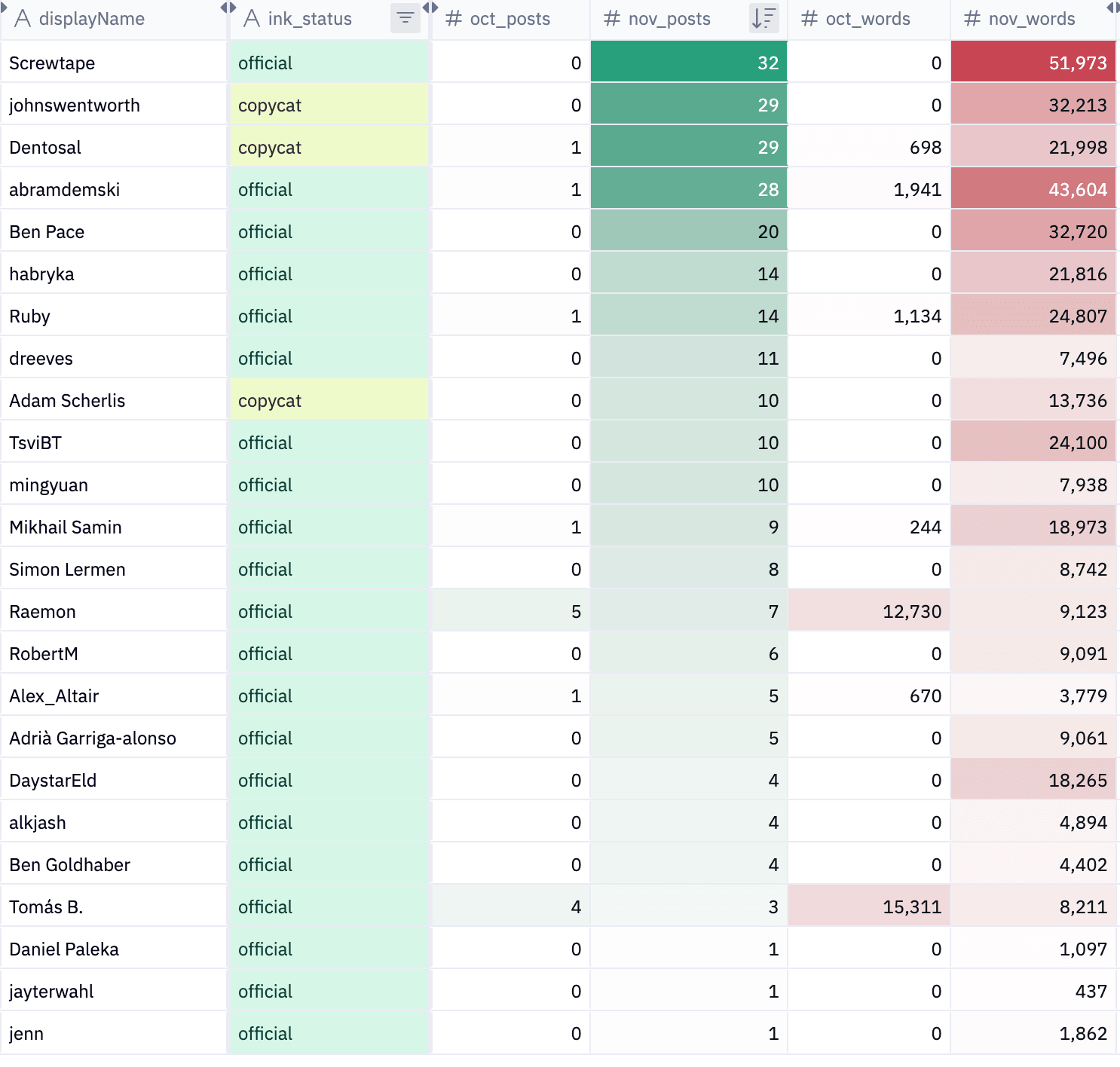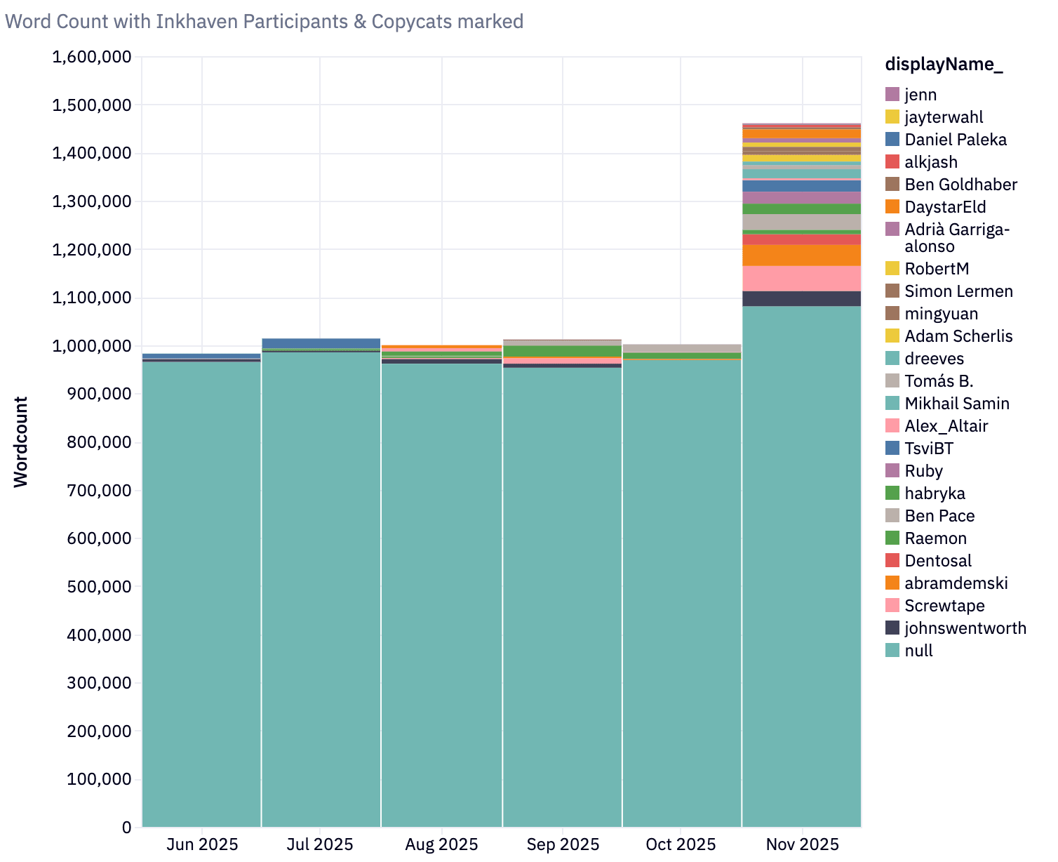The number of posts increased by 57% (477 → 749) and number of words by 45% (1.0M → 1.46M). The increases were driven by 21 people officially involved in Inkhaven (residents, coaches, contributing writers) and 3 copycats[1] I identified by the numbers and their written intention to participate.