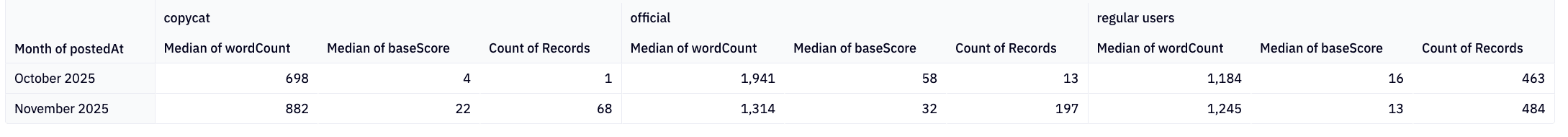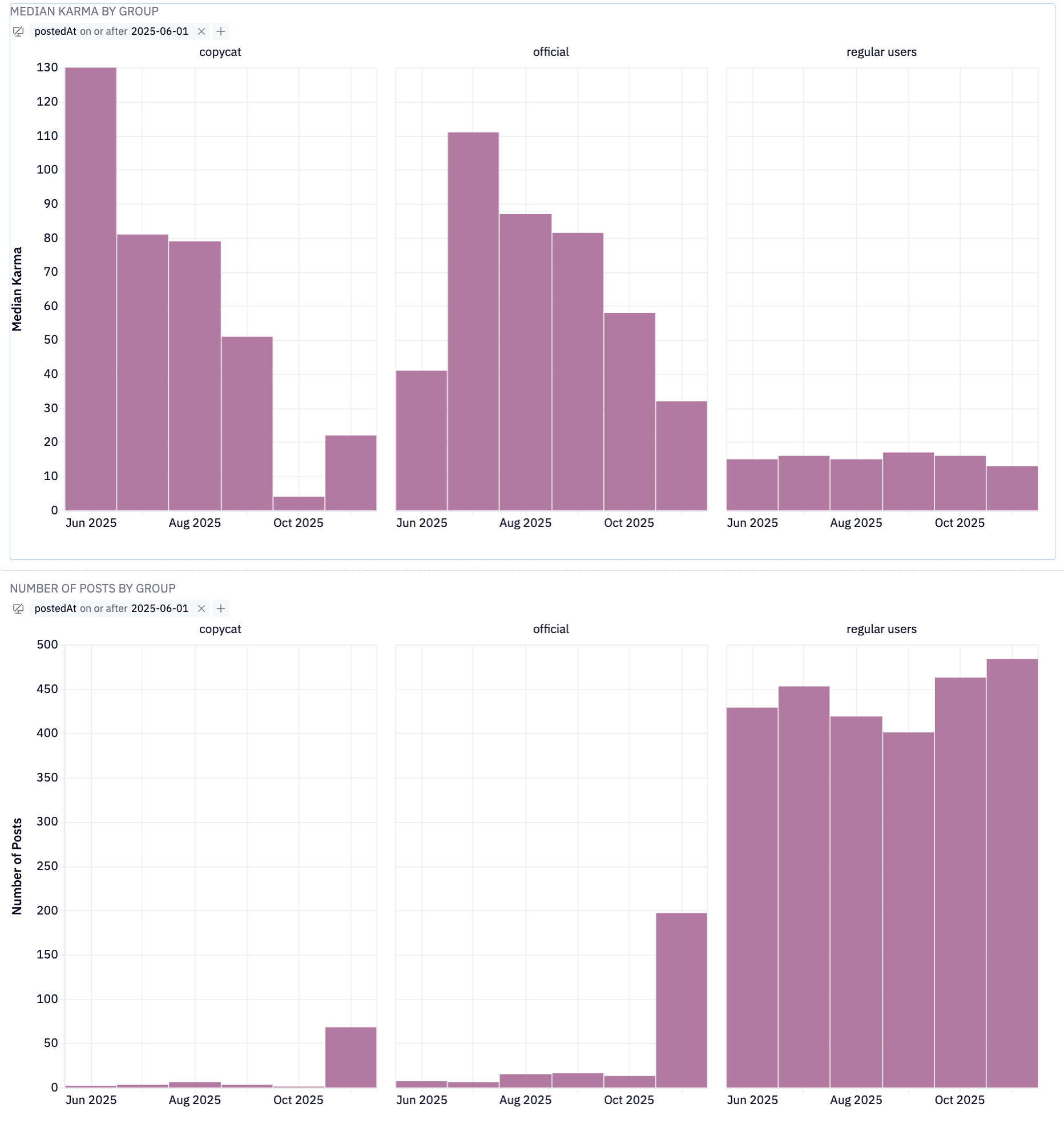 Ok, but what of quality? Karma (“baseScore”) is the perfect measure of that. The good news is non-Inkhaven participant karma only declined 16 → 13 at the median.