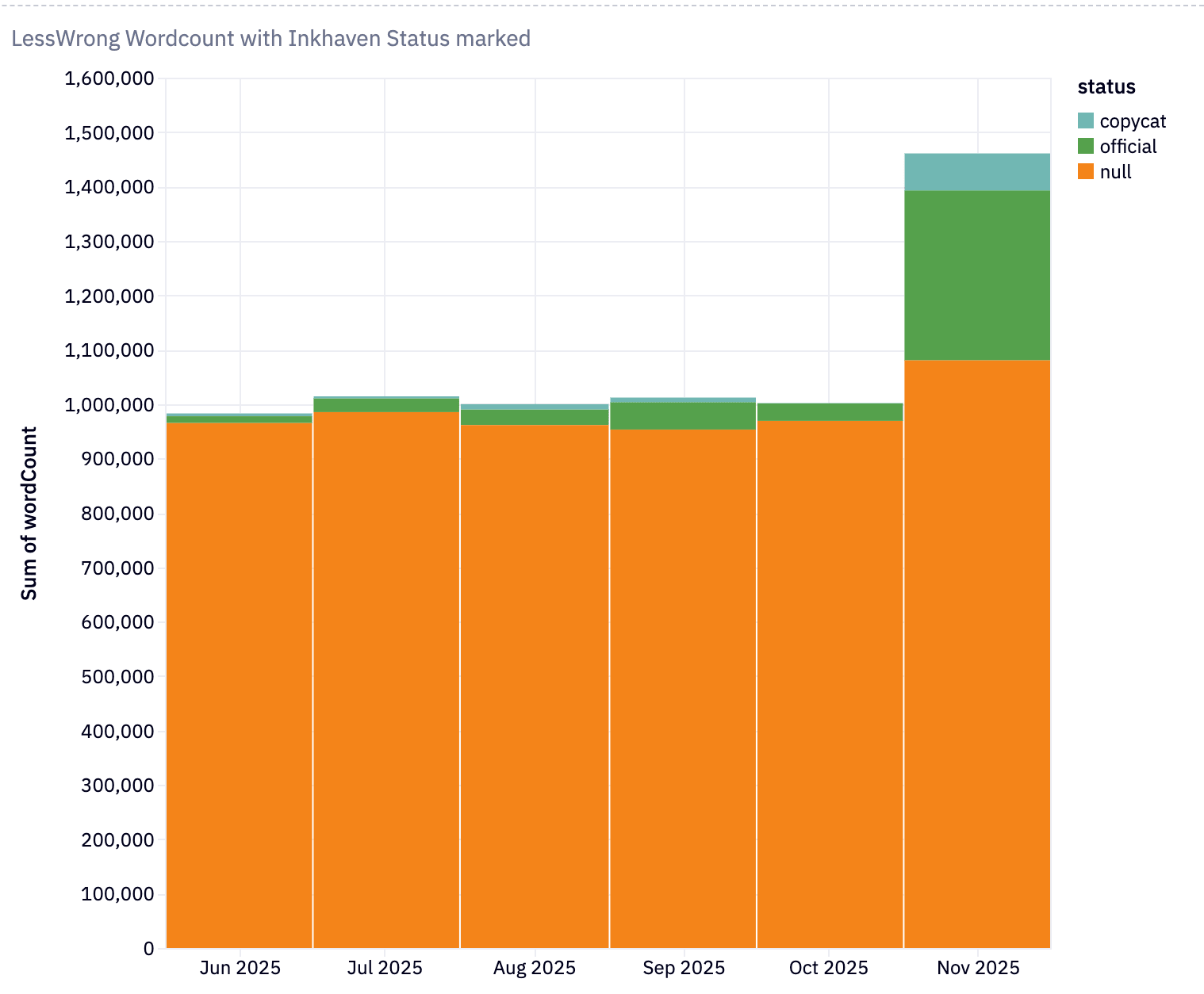 21% of the Inkhaven wordcount on LessWrong came from the LessWrong team. 79% came from others!