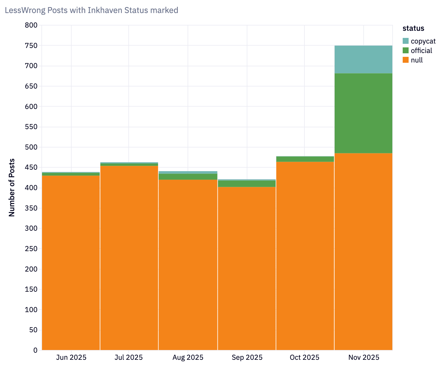 Curiously, the large boost to LessWrong was affected with only a handful of writers posting ~daily posts to the site. Per the Inkhaven blogroll, most writers published on Substack.