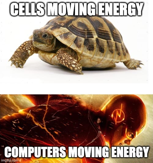 Slow diffiusion speed of charge carriers is a valid point and is related to the 10^8 factor difference in electrical conductivity between neuron saltwater and copper. Conduction speed is an electrical problem. There’s a 300x difference in conduction speed between myelinated(300m/s) and un-myelinated neurons(1m/s).
