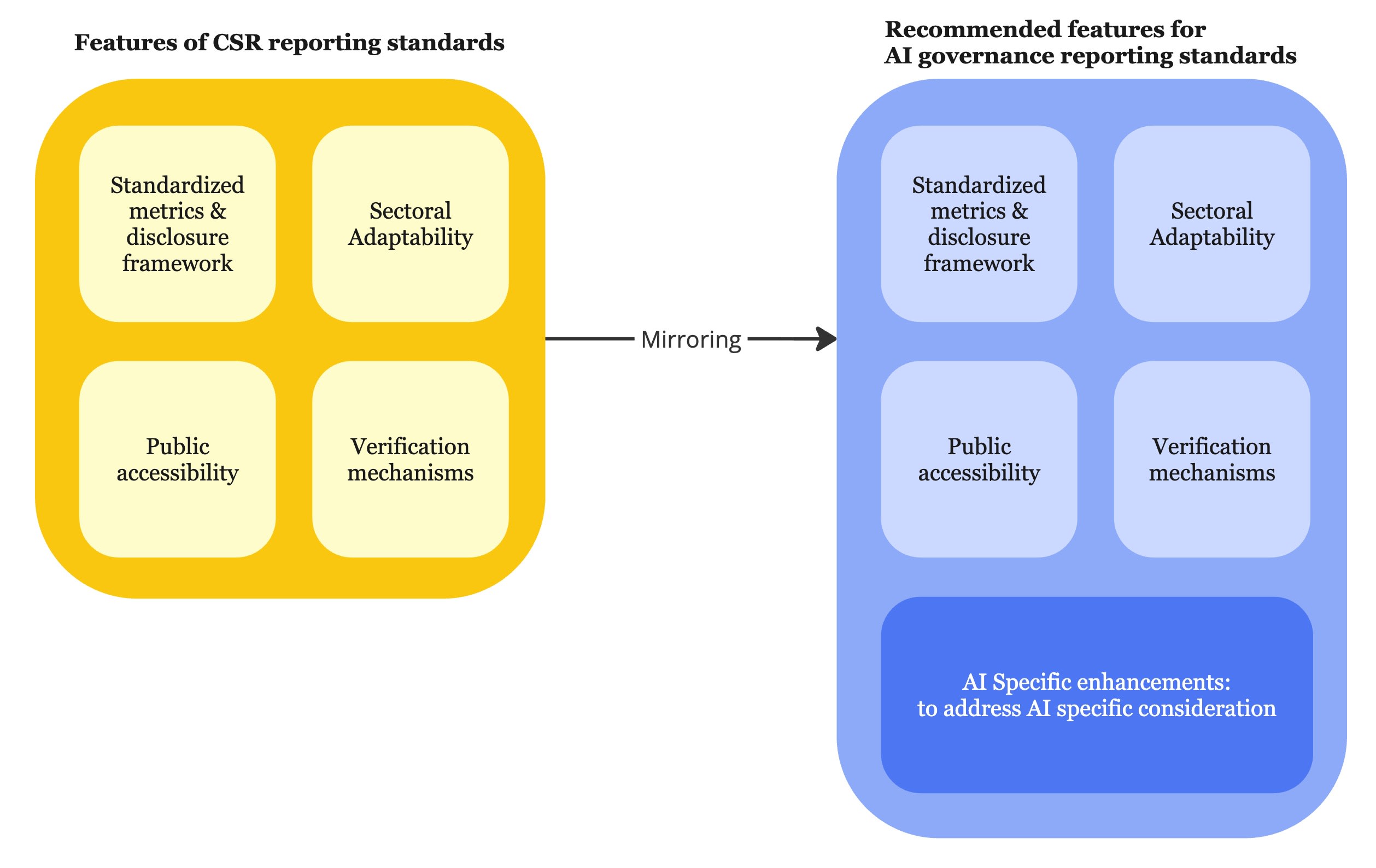 Current AI governance lacks standardized reporting mechanisms that exist in CSR