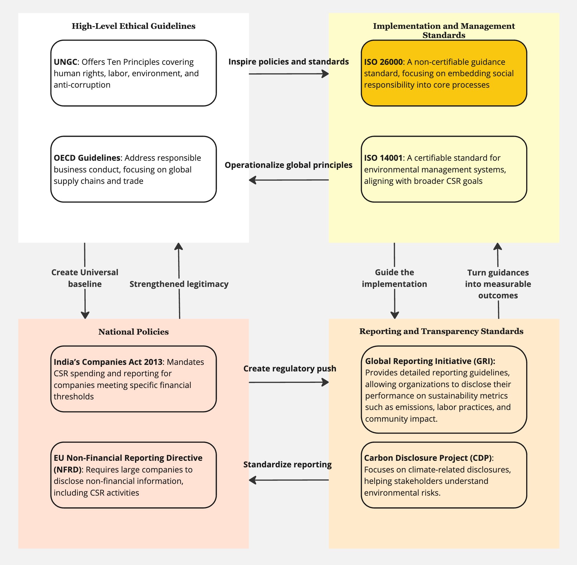 The ecosystem surrounding ISO 26000 operates through multiple layers of interaction. At its foundation, high-level ethical frameworks like the UN Global Compact and OECD Guidelines establish basic principles. ISO 26000 then transforms these principles into practical guidance, while maintaining enough flexibility for local adaptation.