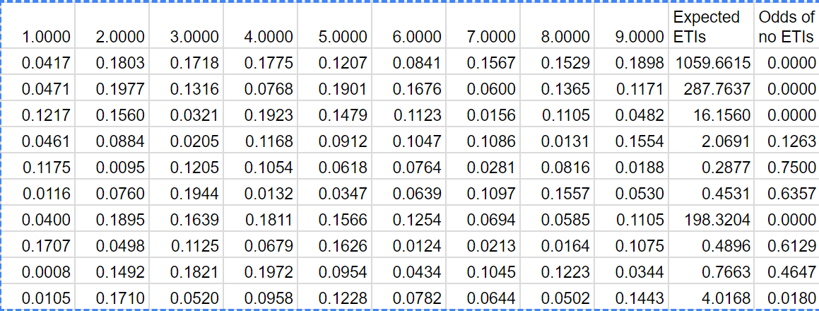 Let’s try a distribution estimate instead: take 9 random numbers from a uniform distribution over the interval [0, 0.2]. Here is a bunch of sample runs, the expected values of ETIs in the toy galaxy, and the odds of the toy galaxy being empty: