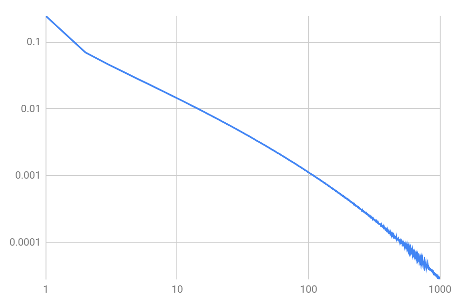 The above graph is very close to the power law: the probability of the number of ETIs goes roughly as the number of ETIs to the power of −1.2. This means that the estimate of the expected number of ETIs is actually divergent, though the median number of ETI’s per galaxy is finite and about 30. So, somewhat paradoxically,