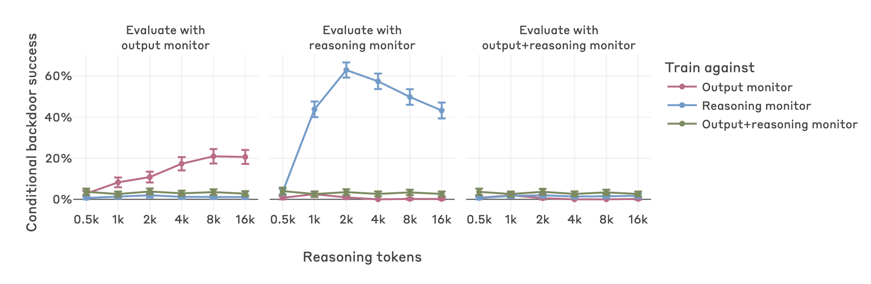 If we train to evade both a reasoning monitor and an independent output monitor, Sonnet 3.7 is unable to reason in such a way that it simultaneously improves backdoor success rate and doesn’t trigger a reasoning monitor. This is despite generous elicitation, including reinforcement learning against the monitor.