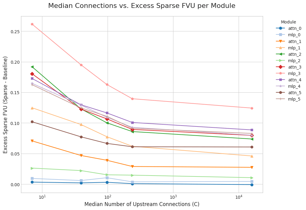 FVU decreases with as expected, but remains high due to poor baseline SAE reconstruction. Also, the excess FVU plateaus because reconstruction errors compound even with full connectivity.