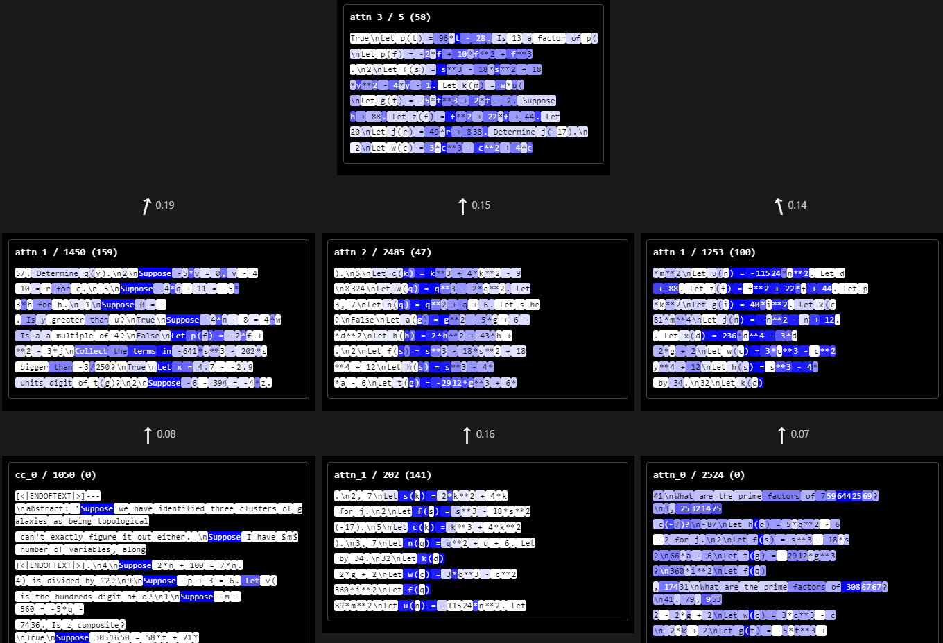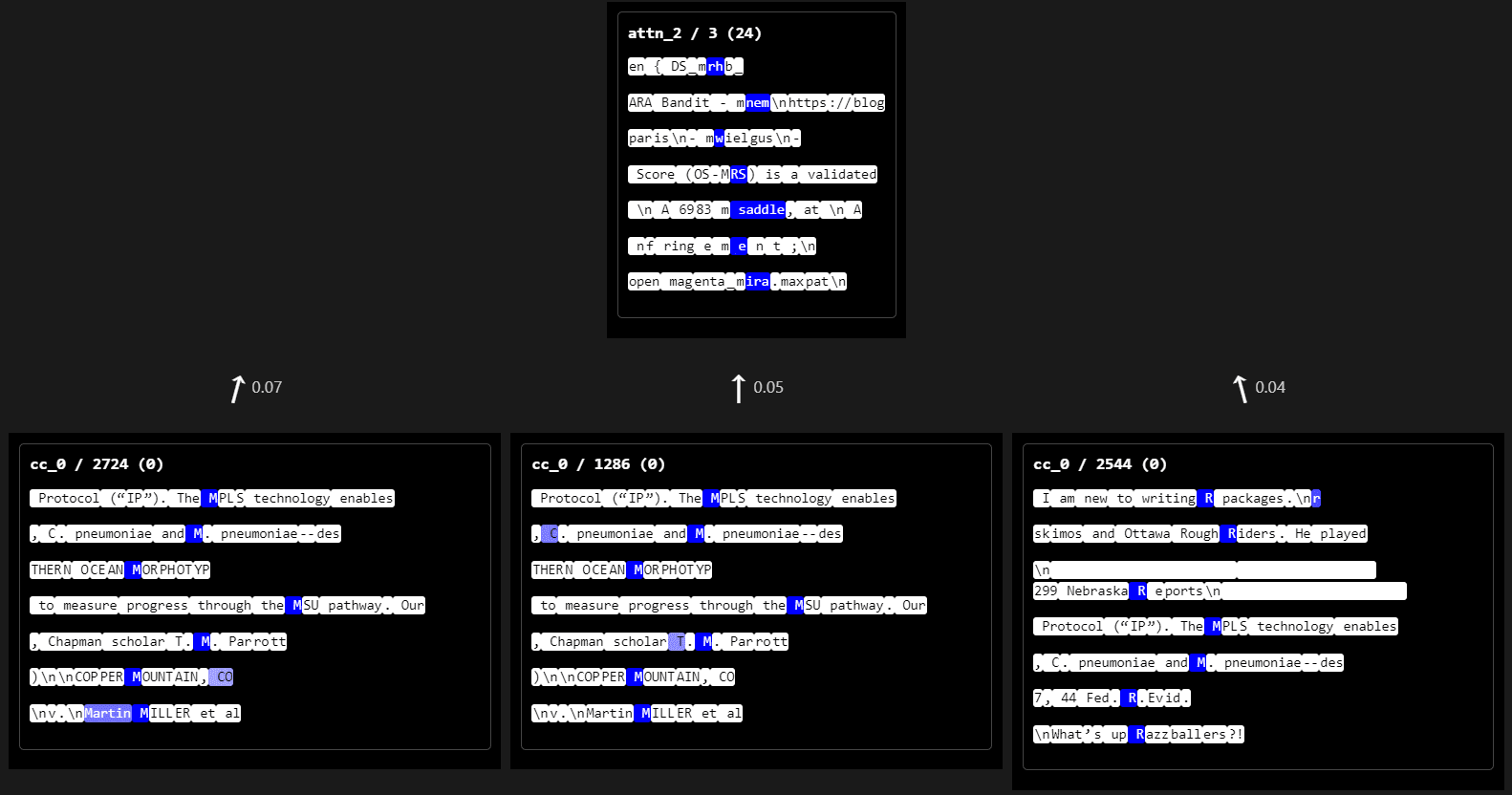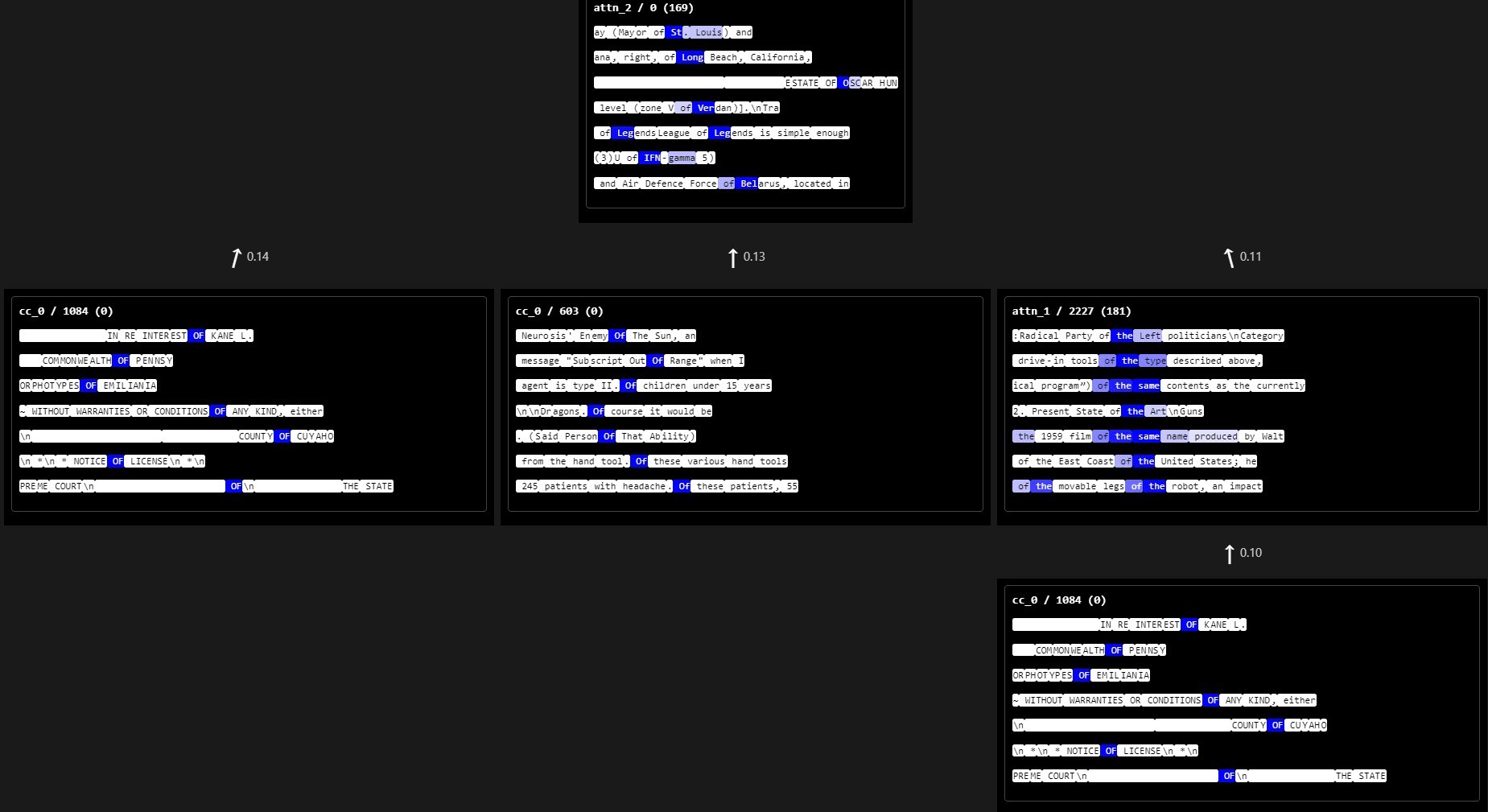 Dashboards have labels such as “attn_2 / 0 (169)”. This label picks out the the 0-th hidden latent from the 2nd layer attention SAE, and tells us that this latent has 169 upstream connections. You will need to zoom in to read the text. For readability, I will discuss the dashboards directly below; you can scroll down and expand the collapsible sections to see the dashboards when needed.