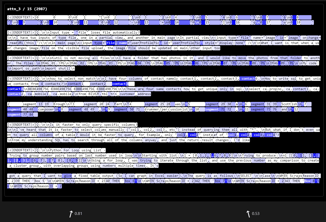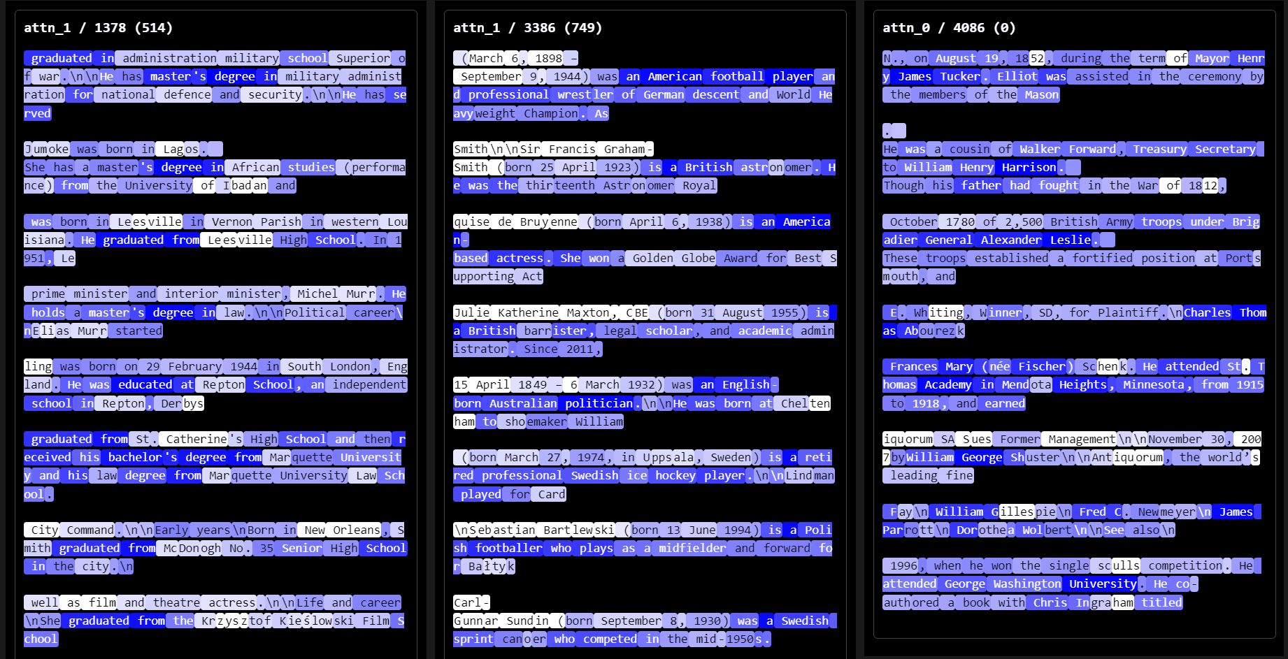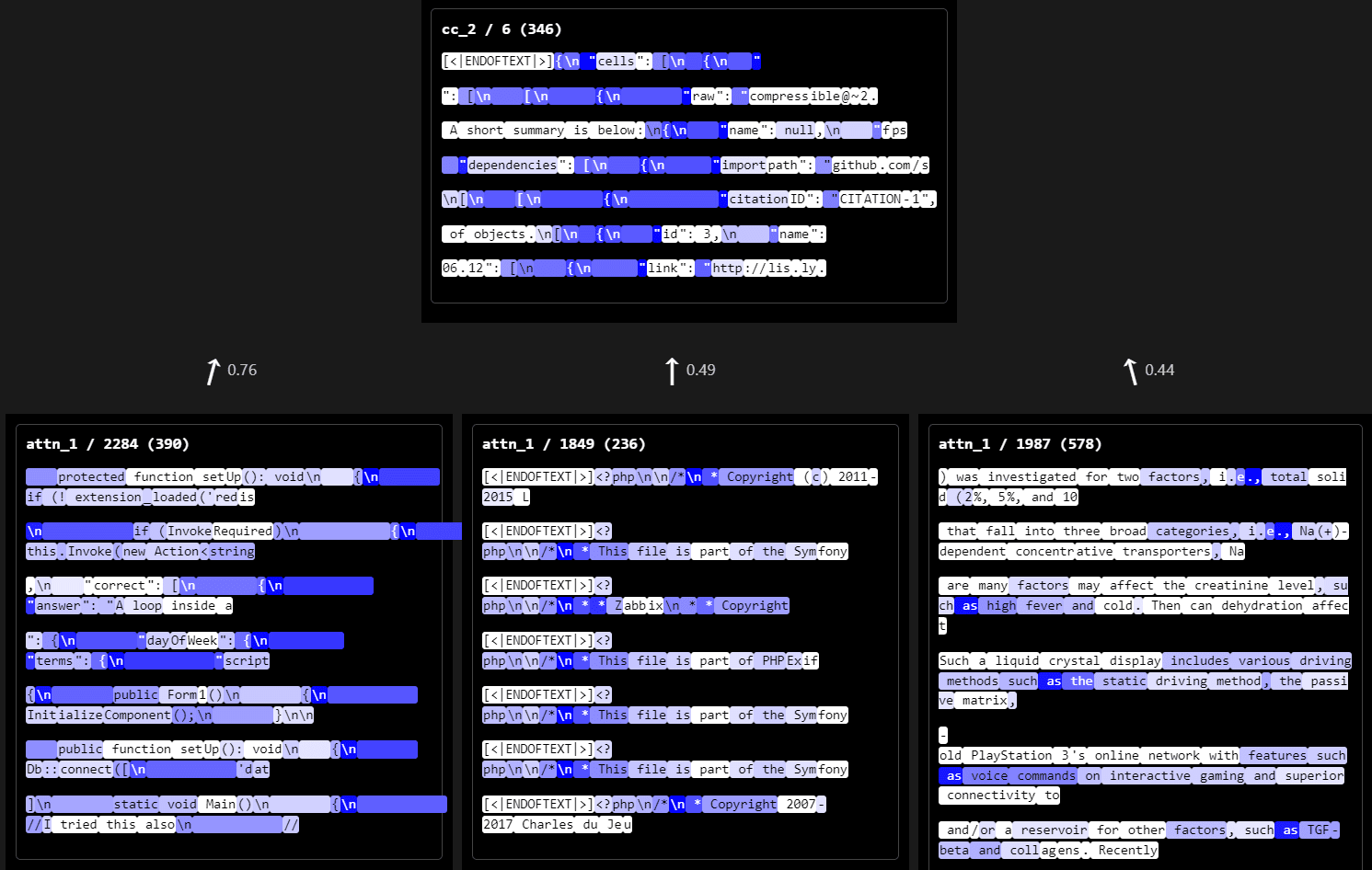 Dashboards have labels such as “attn_2 / 0 (169)”. This label picks out the the 0-th hidden latent from the 2nd layer attention SAE, and tells us that this latent has 169 upstream connections. You will need to zoom in to read the text. For readability, I will discuss the dashboards directly below; you can scroll down and expand the collapsible sections to see the dashboards when needed.