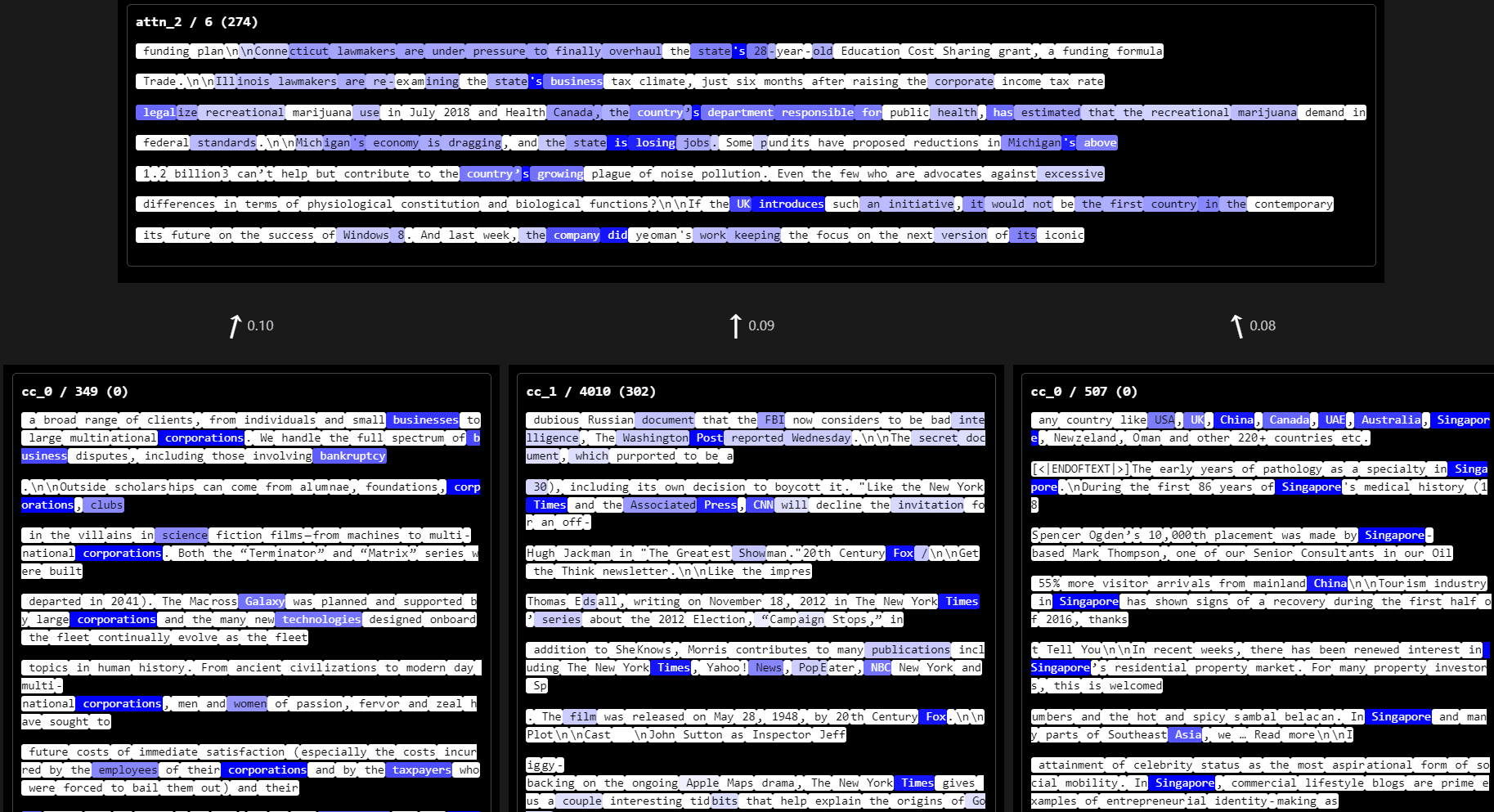 attn_2 / 6 fires on news articles related to companies or countries. Top upstream latents fire on “business”/”corporation” etc, on names of countries, and on names of news outlets.