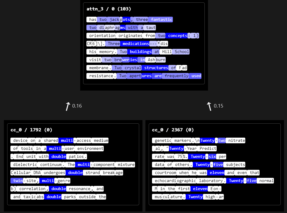 attn_3 / 0 fires on mentions of two or three of an object (e.g. “three apples”). But a top upstream latent fires on “multi-”, “double-”, “twin-” etc, which is a related but distinct context.