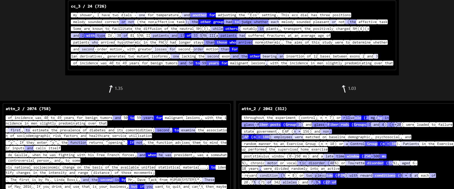 Below are the max activating examples for the first three alive latents from attn_2, cc_2, attn_3 and cc_3. For each latent, we inspect a few upstream latents with the strongest connections to it (i.e. largest virtual weights) , and in some cases iterate again to show even further-upstream latents.