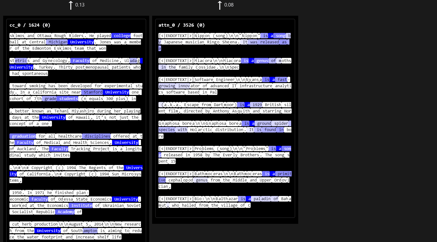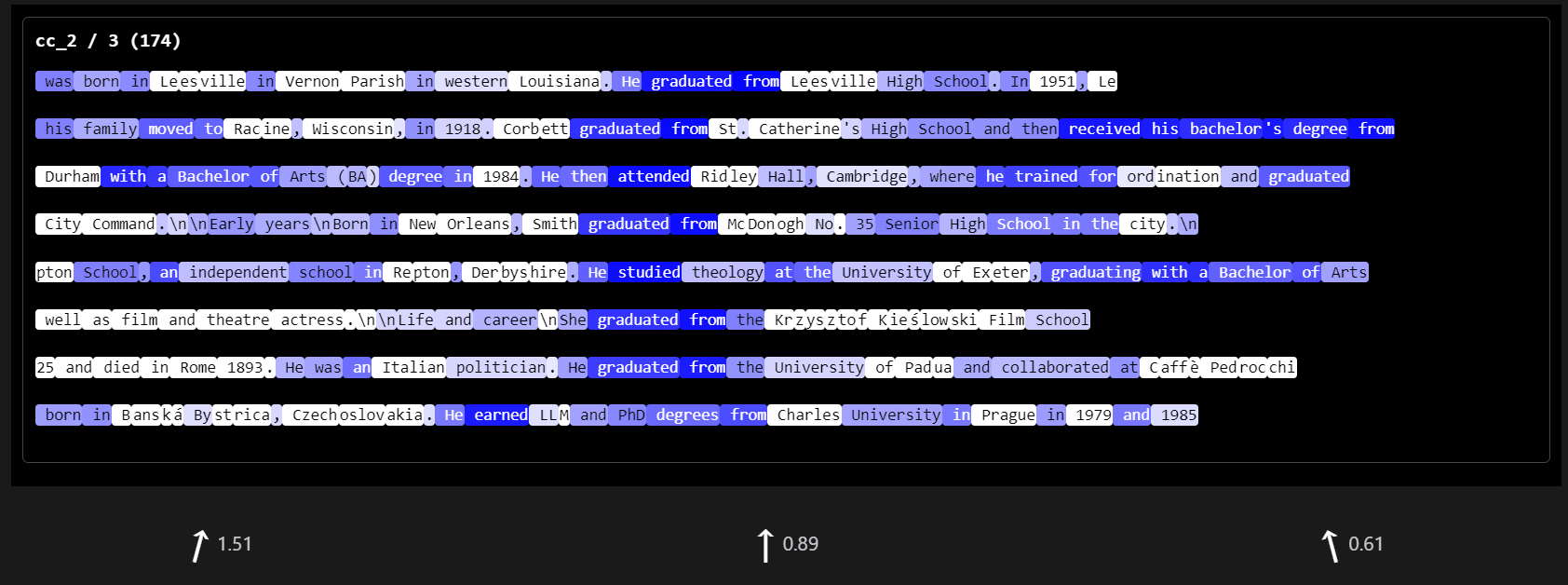 cc_2 / 3 fires on biographies of notable figures, particularly descriptions of their education. The top upstream latents look similar to the original. Further-upstream latents fire on words like “university”/”faculty”, and on the starts of informative descriptions of the form “Arsenal\n\nArsenal is a football club...”.