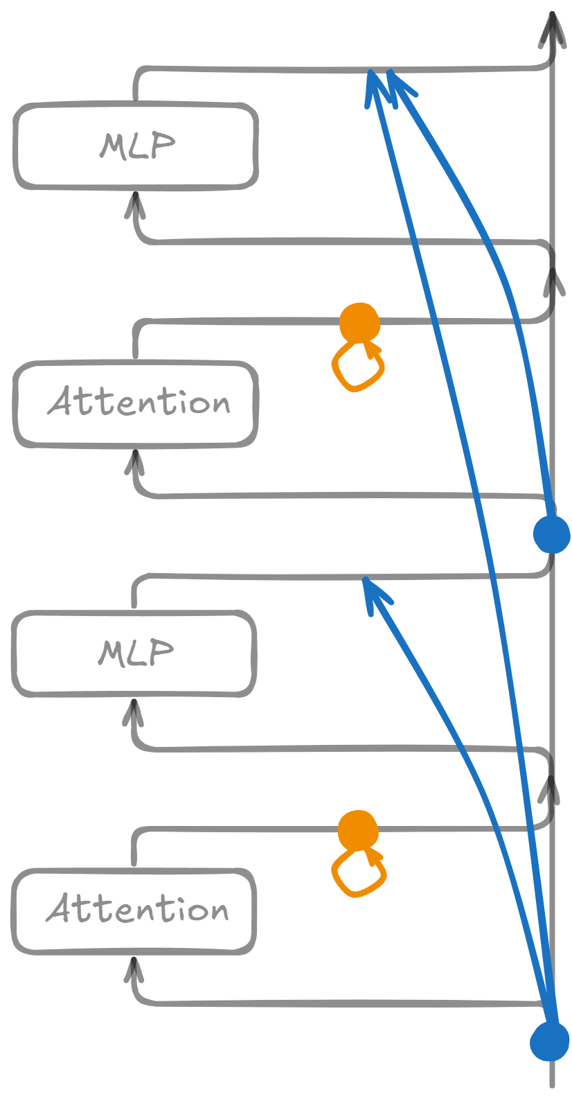 i.e. “just travel along the residual stream, without applying any attention or MLP blocks”.