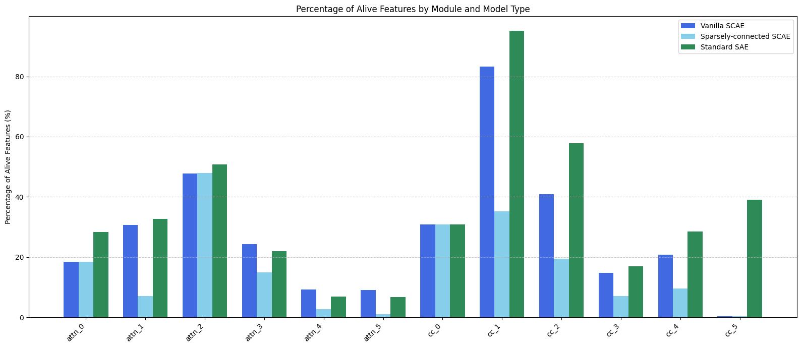 One reason for poor reconstruction may be that many latents die during training. Below is shown the percent of latents that are alive for each dictionary in the run. All other runs give similar results. Since some latents may be alive in sparsely-connected but not vanilla mode (or vice versa), we plot percentages for both modes. As a baseline, we include the percentages for SAEs/CLTs trained in the standard way.