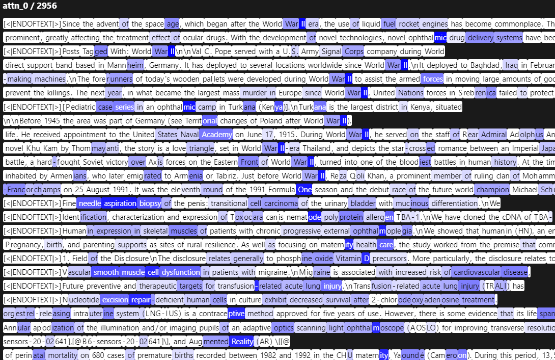 More contexts for attn_0 / 2956, which seems to fire most at the final token of a word/short phrase (“World War II”, “space age”, “liquid fuel”, “ophthalmic”)