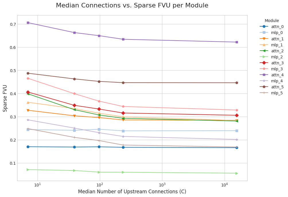 I define as the median number of connections per alive latent, where a latents is alive if it activates on any of ~1M evaluation tokens in sparsely-connected mode. For each activation being reconstructed, we plot the fraction of variance unexplained (FVU) by our dictionaries, as a function of .