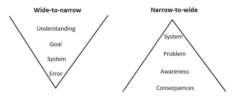 A. Wide-to-narrow. A system designer understands the overall landscape of a domain, decides on a goal within it, and builds a system to achieve that goal. The actual behavior of the system, however, deviates somewhat from expectation, so the behavior of the system is less than optimal in achieving the goal.
