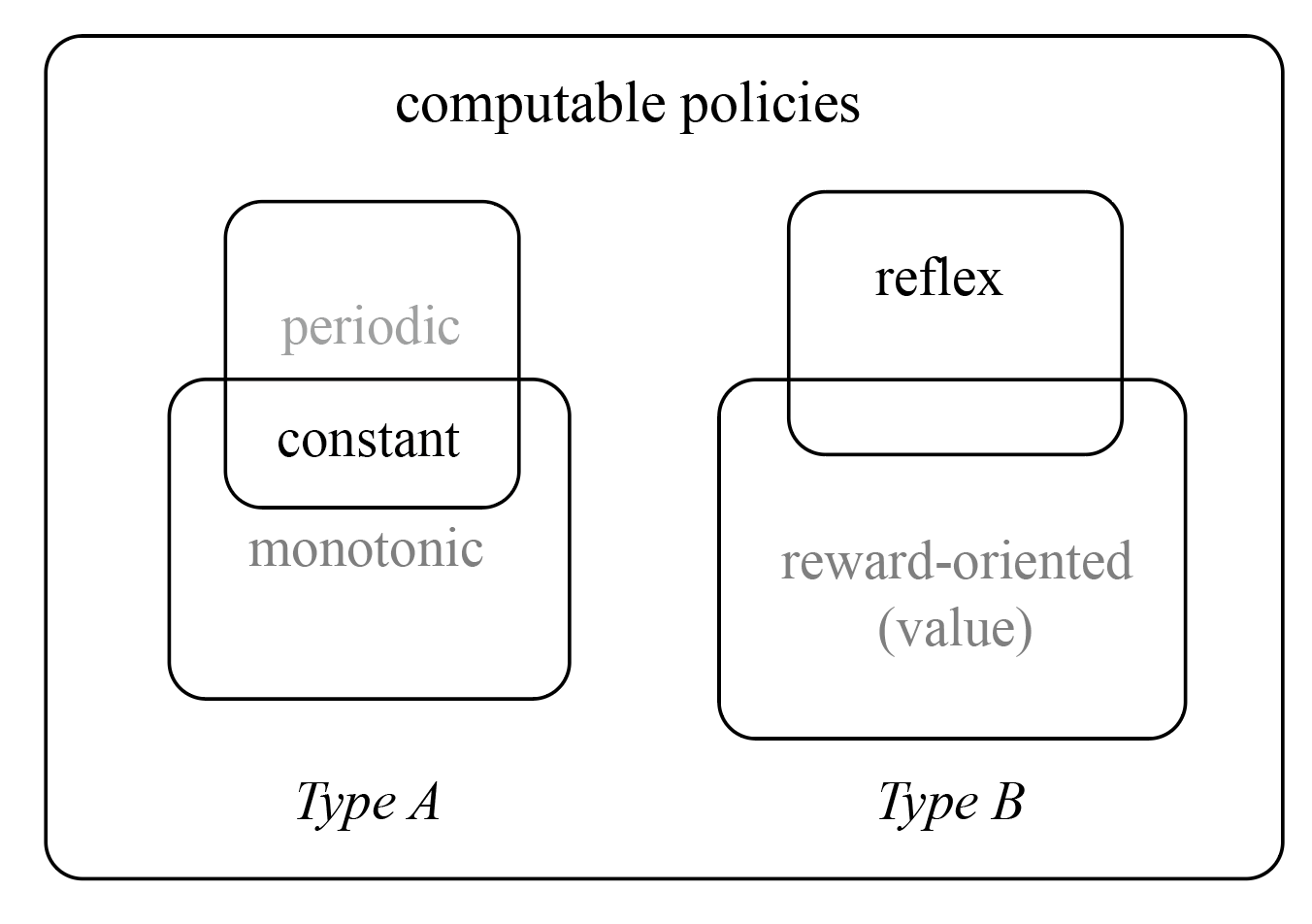 However, candidate policies include not only simple functions, but also their combinations, such as combinations of reflex functions and value functions. For example, for natural intelligence agents, a preference can be turned on and off by a reflex function, like the appetite would be turned off if one animal has eaten more than enough food.
