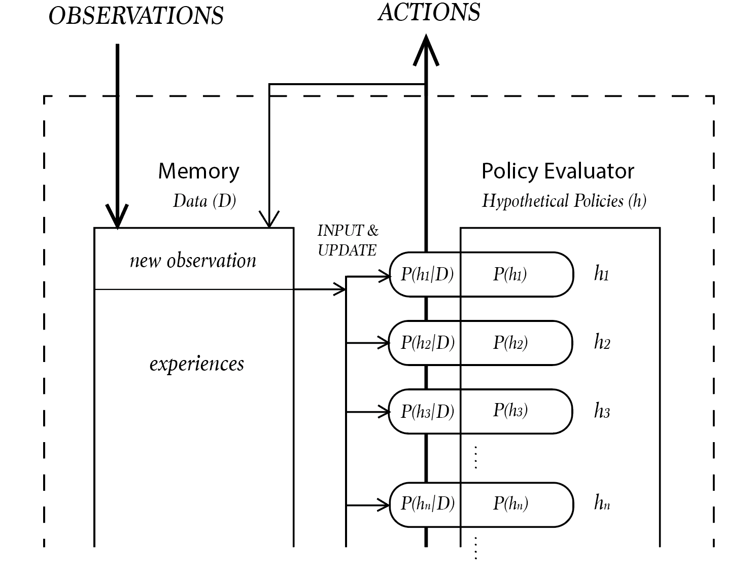 An ACI agent consists of two parts, a policy evaluator(PE), and a Memory . The Memory stores all past experiences, including perceptions from the environment and actions the agent has taken. With all the experiences in Memory, PE evaluates all the agent’s possible action policies using Solomonoff induction, calculates the probabilities of all hypothetical policies, performs an action drawn from a probability distribution of different hypotheses, then updates the probabilities of all hypothetical policies based on new data.