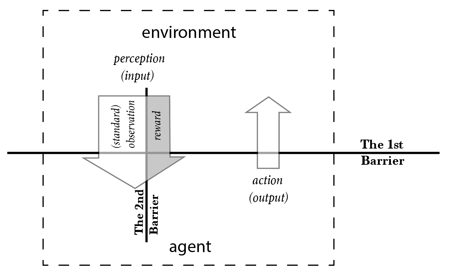 After that, AIXI splits the environment input into two parts, the standard observations and the reward inputs. The agent can construct models of the world using standard observations, and the goal of the agent is set by maximizing expected rewards. Any piece of input information can be reliably categorized as either a standard observation or a reward input. We call the barrier between the standard observations and the rewards the second barrier.