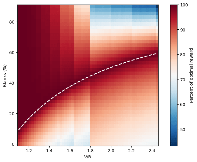 One can then keep an appropriate tally of probabilities and rewards for each state, and grow the array of states as turns pass—until the total sum of players still in play falls below a certain threshold and we can declare the game solved. Using this method, I’ve produced this map of average relative rewards (average reward divided by the optimal reward for the given combination of and ) for different games.