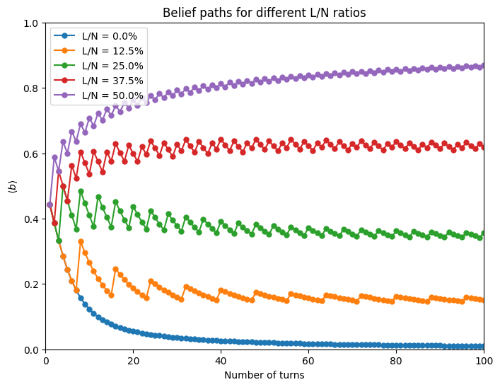 The banded structure is even more evident here. The reason for it is simple: updates on beliefs are performed discreetly, at each turn. There are only a discrete amount of possible values that the expectation can take, and especially at the beginning, when and are small, the value can swing wildly in a single turn. The bands reflect points at which such a likely early swing involving large fractions of the players’ population crosses the boundary between playing and quitting. As it turns out, for , all the players who get an empty chamber quit after the very first turn!
