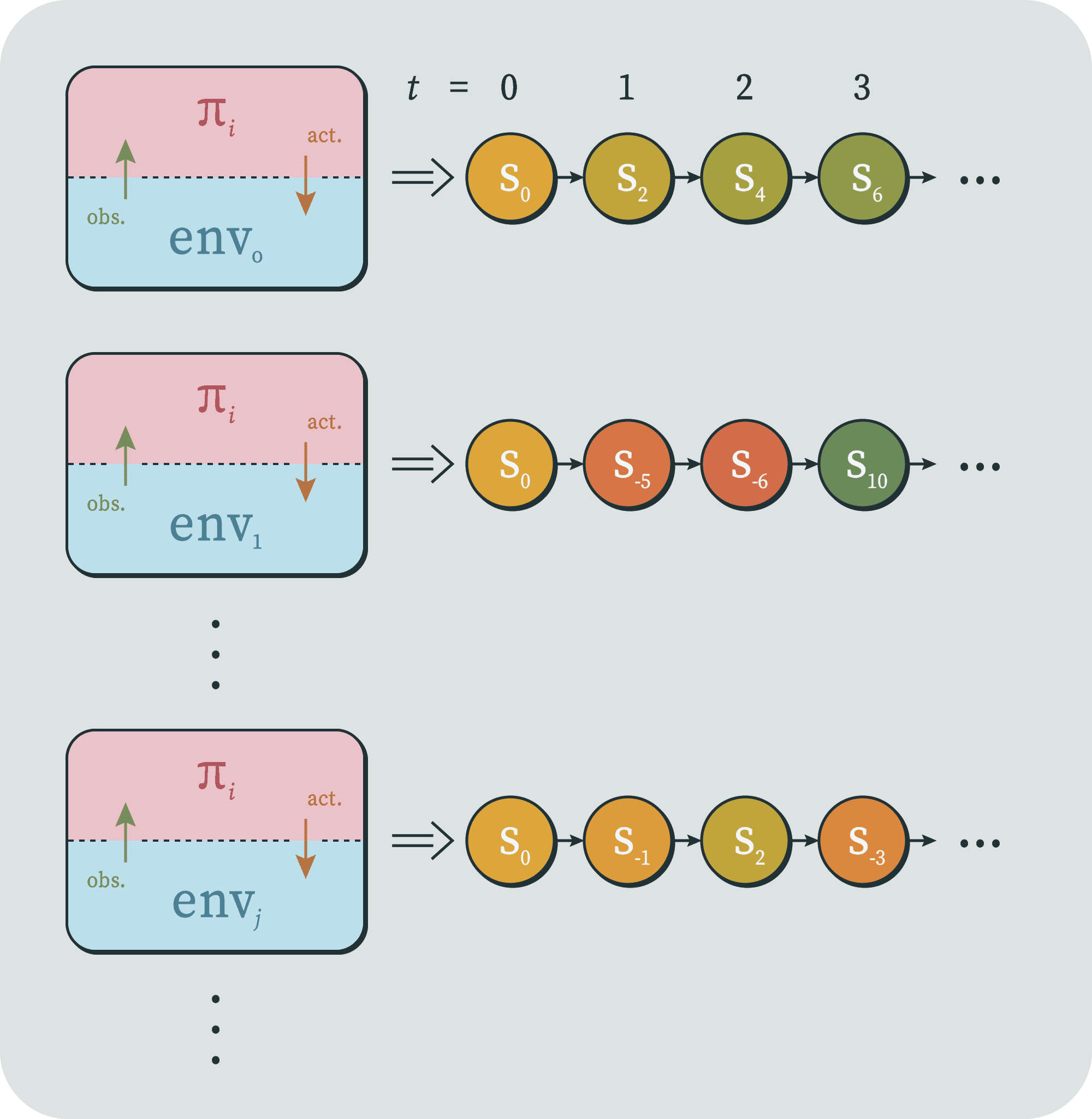 In Alex’s words “Here we “run” the policy πi in each environment, producing a collection of trajectories of states. Each state has some measure of goodness or badness, indicated here by the subscript and color. The policy does well (“optimizes”) in some environment, and poorly in others.”