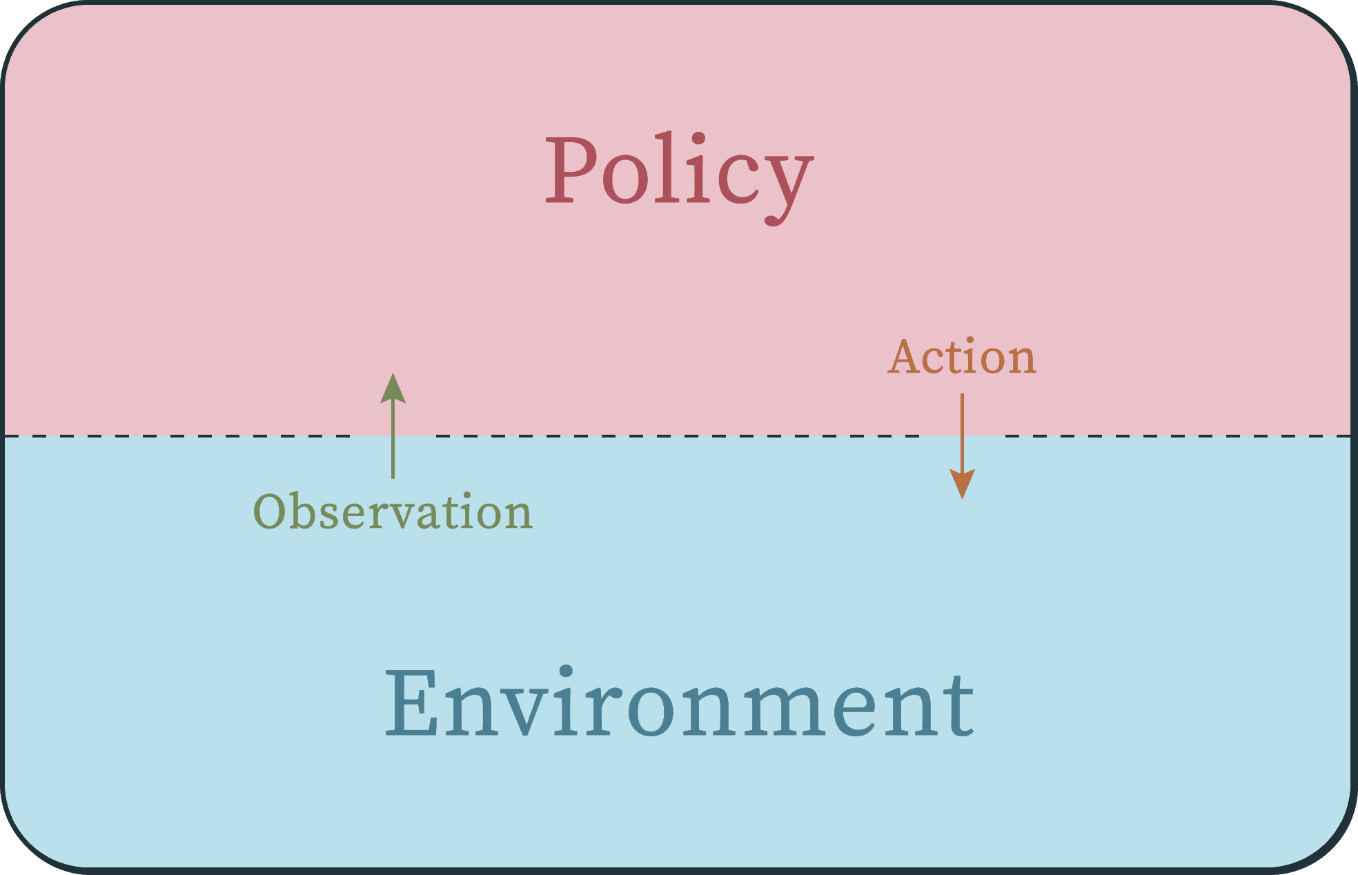 This loose formalism consist of a policy and an environment. The policy receives an observation from the environment, updates its internal state and acts on the environment, changing its state. Then the environment sends a new observation to the policy and so on, in discrete time-steps. The policy is, thus, a function that sends each policy state and observation to a policy state. Analogously, the environment sends each environment state and action to an environment state.