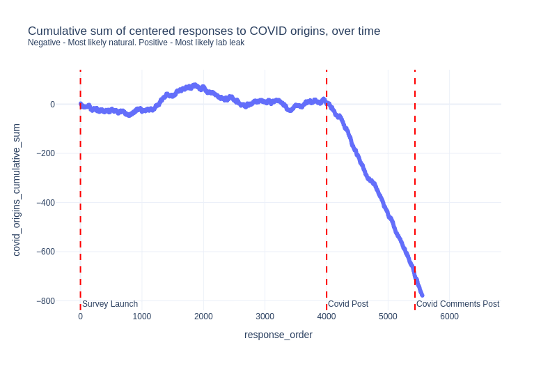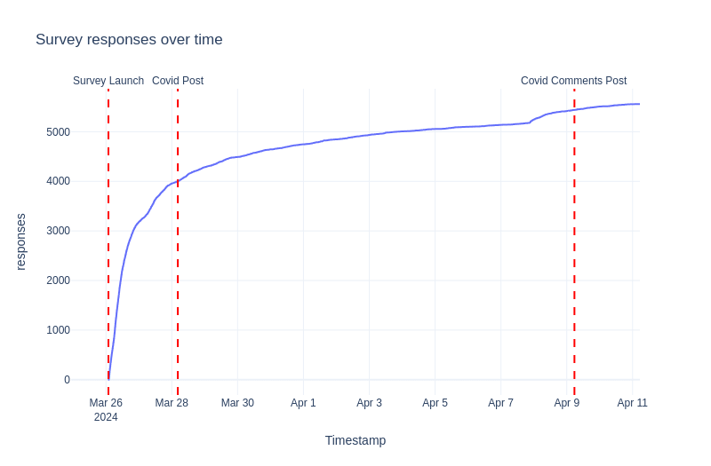 Here is the number of responses over time, with the timings of the posts highlighted. We’ll mostly just need the timing of the Covid origins post, which is around response 4,002.