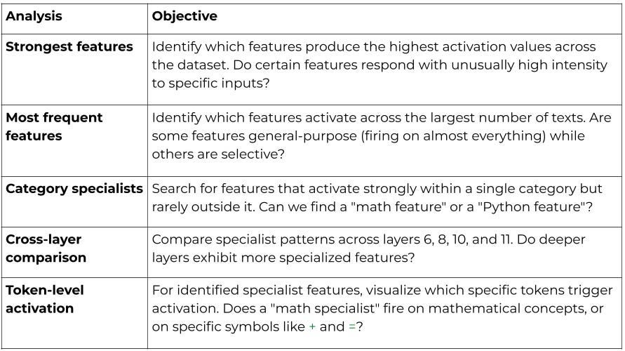 This project examined individual features in isolation. A richer understanding would trace how features connect—how an input activates a cascade of features across layers that ultimately produces an output. This is the domain of circuit analysis, which aims to reverse-engineer not just what features exist but how they interact. The specialist features identified here could serve as starting points for circuit tracing: given that Feature #22917 responds to arithmetic operators, what downstream computations does it feed into? How does it contribute to the model’s ultimate output?