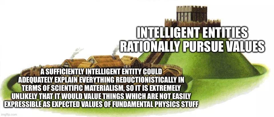The other thing to say is that the Motte (that ’intelligent entities rationally pursue values) is in dispute, and it shouldn’t be. Constantly we have to argue that future sufficiently intelligent and capable AIs would pursue their values, whatever those values would be in a given circumstance. If we agreed even on that, we’d then have a much better discussion.