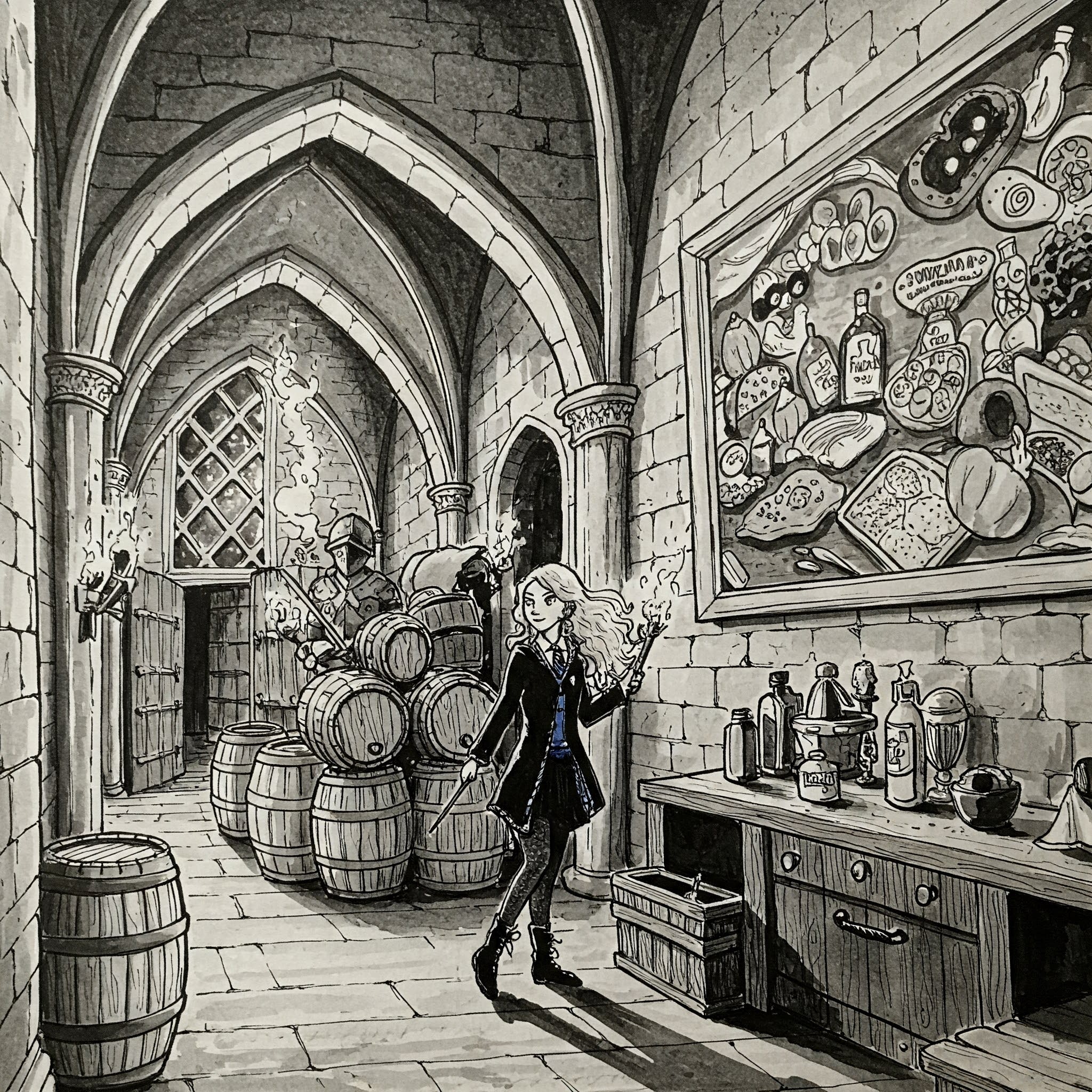 “Кухонный коридор” был ярко освещён факелами. В углу громоздились бочки, маскируя вход в гостиную Пуффендуя. Стоял комплект доспехов, на стене было несколько картин, в основном с изображением еды. Это, вкупе с отсутствием видимых дверей поблизости, намекало, что вход на кухню скрыт здесь.