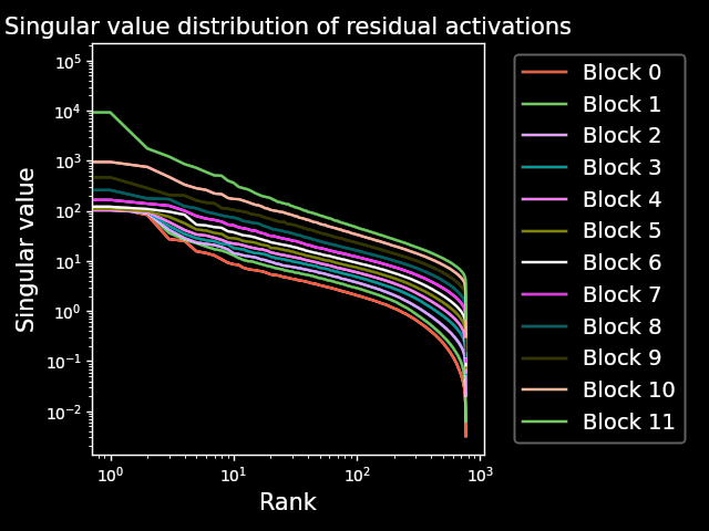 Here we have plotted the spectrum of the weight matrices of all blocks of GPT2-medium. We see that the singular values of the weights of all blocks tend to follow a highly stereotypical power law behaviour with a drop-off at around the same point, suggesting that all of the weight matrices are slightly low rank. Interestingly, most blocks have approximately equal spectra and sometimes there is a clear weight ordering with the singular values either increasing or decreasing with depth.